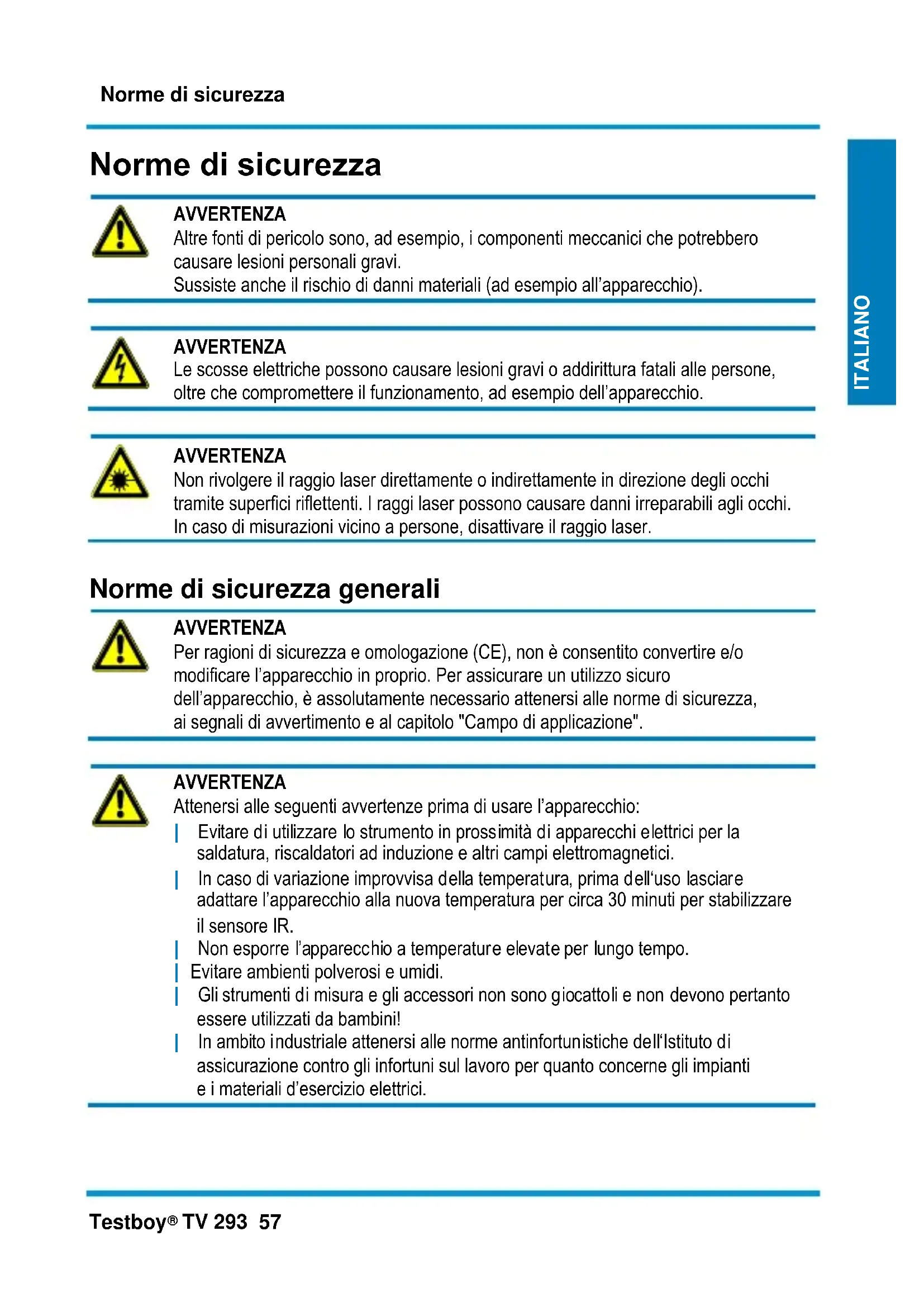 AVVERTENZA Attenersi alle seguenti avvertenze prima di usare l’apparecchio: | Evitare di utilizzare lo strumento in prossimità di apparecchi elettrici per la saldatura, riscaldatori ad induzione e altri campi elettromagnetici. | In caso di variazione improvvisa della temperatura, prima dell‘uso lasciare adattare l’apparecchio alla nuova temperatura per circa 30 minuti per stabilizzare il sensore IR. | Non esporre l’apparecchio a temperature elevate per lungo tempo. | Evitare ambienti polverosi e umidi. | Gli strumenti di misura e gli accessori non sono giocattoli e non devono pertanto essere utilizzati da bambini! | In ambito industriale attenersi alle norme antinfortunistiche dell‘Istituto di assicurazione contro gli infortuni sul lavoro per quanto concerne gli impianti e i materiali d’esercizio elettrici.Norme di sicurezza 58 Testboy