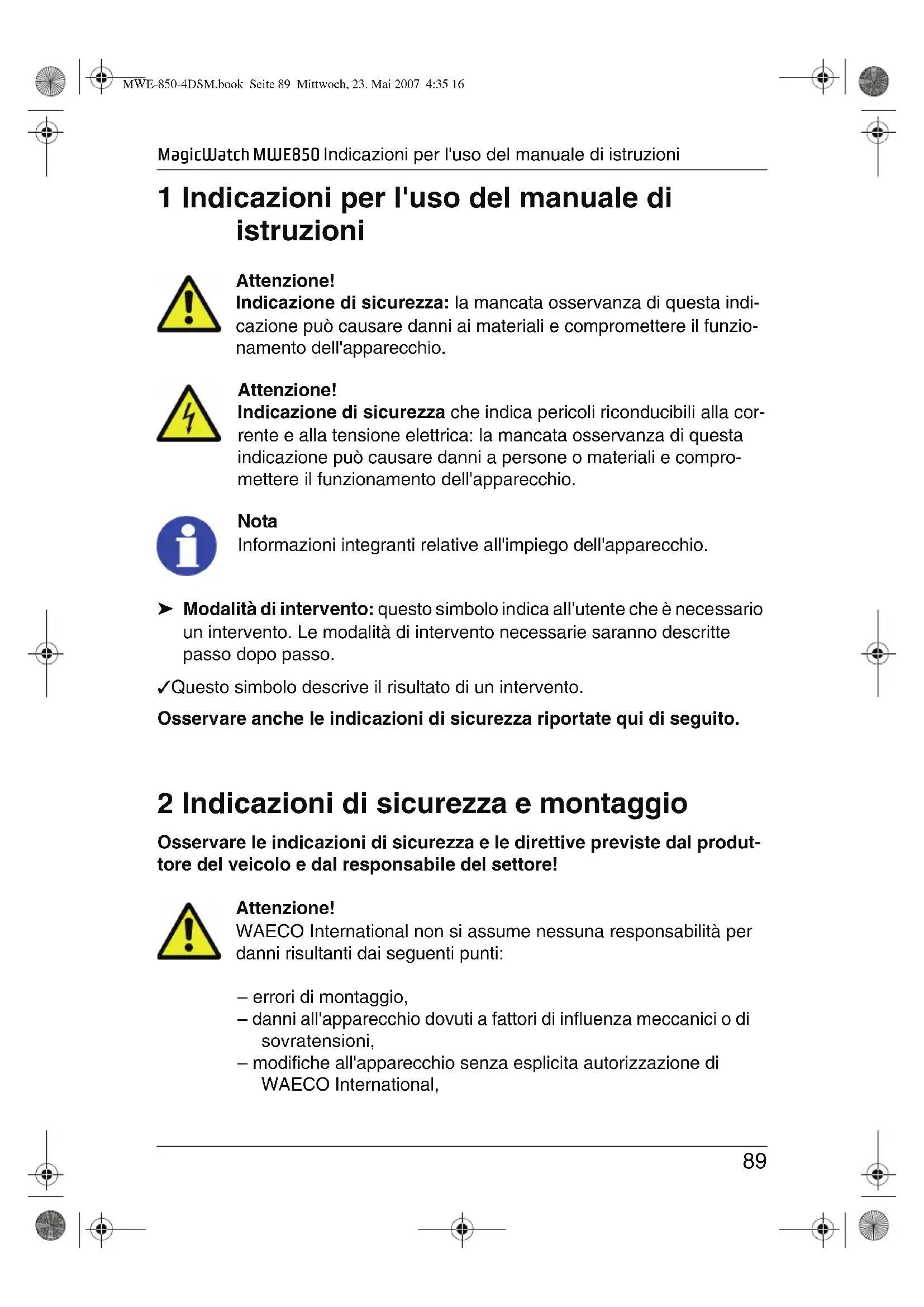 1 Indicazioni per l'uso del manuale di istruzioni Attenzione! Indicazione di sicurezza: la mancata osservanza di questa indi- cazione può causare danni ai materiali e compromettere il funzio- namento dell'apparecchio. Attenzione! Indicazione di sicurezza che indica pericoli riconducibili alla cor- rente e alla tensione elettrica: la mancata osservanza di questa indicazione può causare danni a persone o materiali e compro- mettere il funzionamento dell'apparecchio. Nota Informazioni integranti relative all'impiego dell'apparecchio. ➤ Modalità di intervento: questo simbolo indica all'utente che è necessario un intervento. Le modalità di intervento necessarie saranno descritte passo dopo passo. ✓ Questo simbolo descrive il risultato di un intervento. Osservare anche le indicazioni di sicurezza riportate qui di seguito. 2 Indicazioni di sicurezza e montaggio Osservare le indicazioni di sicurezza e le direttive previste dal produt- tore del veicolo e dal responsabile del settore! Attenzione! WAECO International non si assume nessuna responsabilità per danni risultanti dai seguenti punti: – errori di montaggio, – danni all'apparecchio dovuti a fattori di influenza meccanici o di sovratensioni, – modifiche all'apparecchio senza esplicita autorizzazione di WAECO International, MWE-850-4DSM.book Seite 89 Mittwoch, 23. Mai 2007 4:35 16Indicazioni di sicurezza e montaggio MagicWatch MWE850