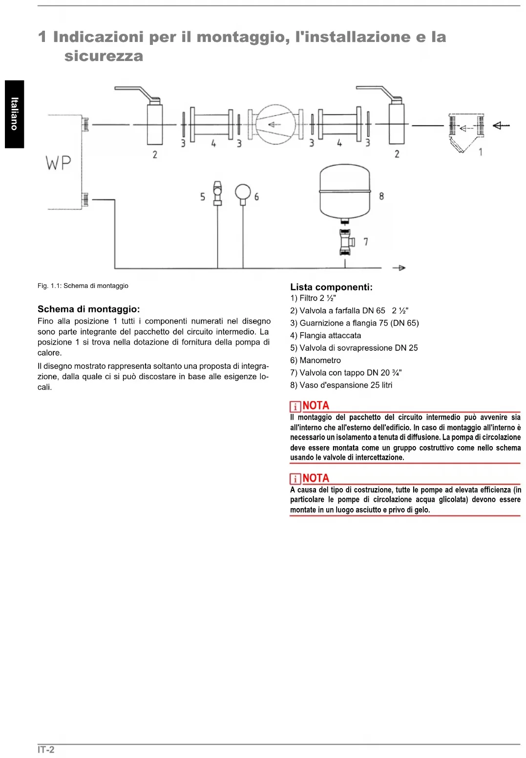 NOTA Il montaggio del pacchetto del circuito intermedio può avvenire sia all'interno che all'esterno dell'edificio. In caso di montaggio all'interno è necessario un isolamento a tenuta di diffusione. La pompa di circolazione deve essere montata come un gruppo costruttivo come nello schema usando le valvole di intercettazione. NOTA A causa del tipo di costruzione, tutte le pompe ad elevata efficienza (in particolare le pompe di circolazione acqua glicolata) devono essere montate in un luogo asciutto e privo di gelo.IT-3 Italiano