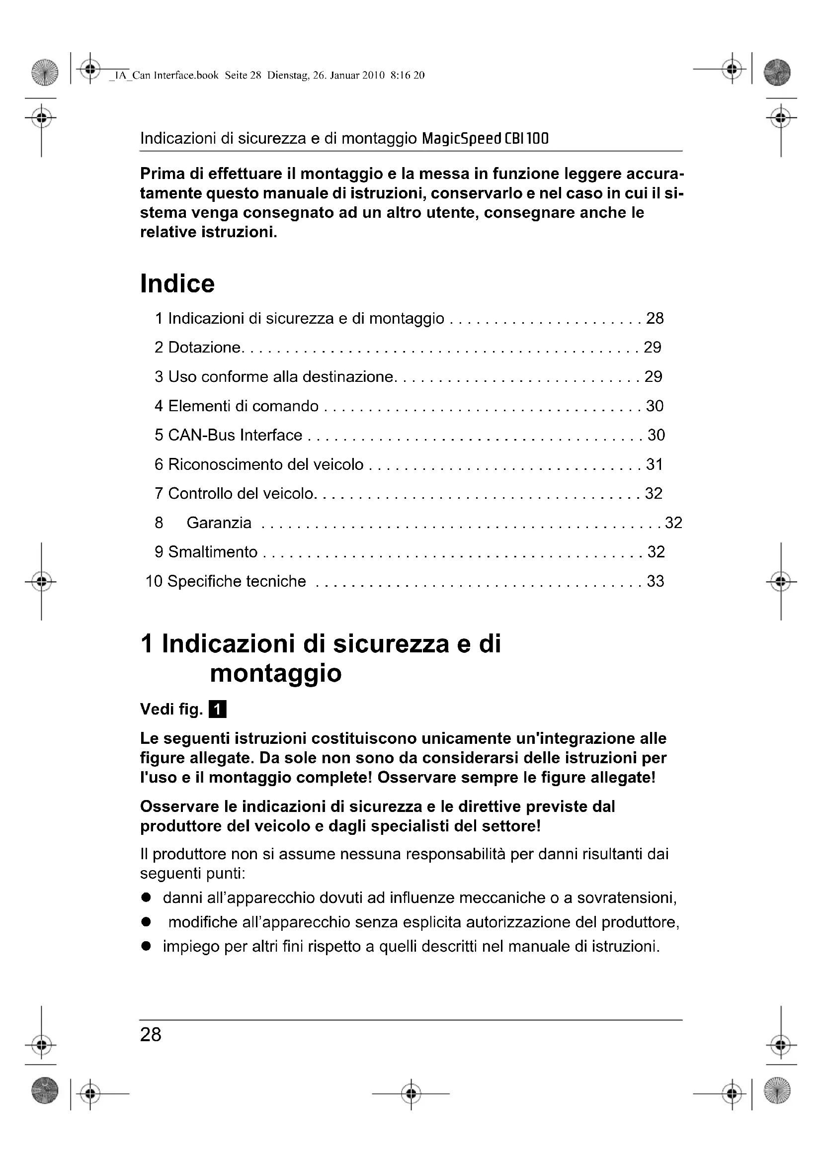 - 10 Specifiche tecniche 1 Indicazioni di sicurezza e di montaggio Vedi fig. 1 Le seguenti istruzioni costituiscono unicamente un'integrazione alle figure allegate. Da sole non sono da considerarsi delle istruzioni per I'uso e il montaggio complete! Osservare sempre le figure allegate! Osservare le indicazioni di sicurezza e le direttive previste dal produttore del veicolo e dagli specialisti del settore! Il produttore non si assume nessuna responsabilità per danni risultanti dai seguenti punti: z danni all’apparecchio dovuti ad influenze meccaniche o a sovratensioni, z modifiche all’apparecchio senza esplicita autorizzazione del produttore, z impiego per altri fini rispetto a quelli descritti nel manuale di istruzioni. _IA_Can Interface.book Seite 28 Dienstag, 26. Januar 2010 8:16 20MagicSpeed CBI 100 Dotazione p. 33