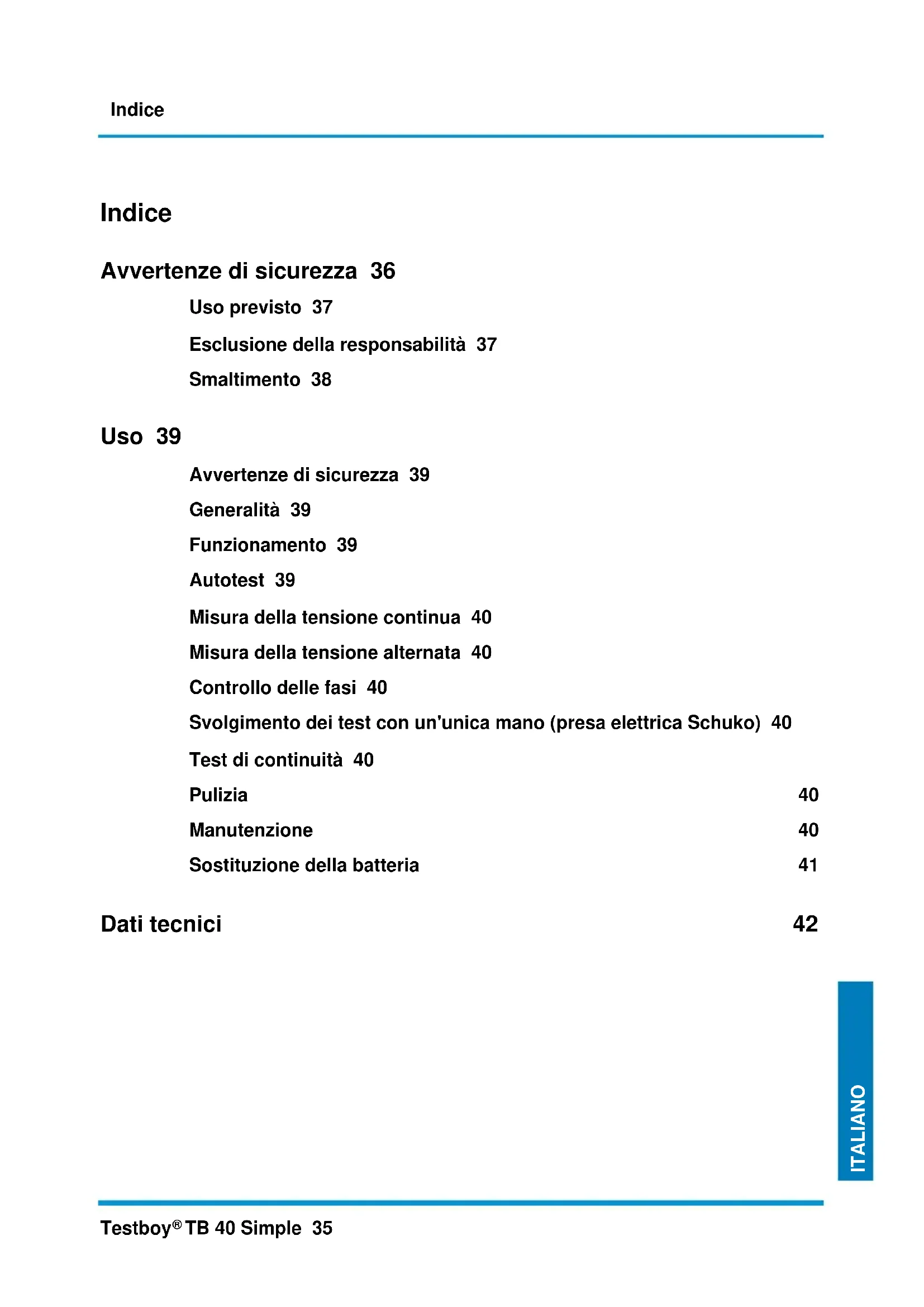 TB 40 Simple 35 ENGLISH ITALIANO Indice Avvertenze di sicurezza 36 Uso previsto 37 Esclusione della responsabilità 37 Smaltimento 38 Uso 39 Avvertenze di sicurezza 39 Generalità 39 Funzionamento 39 Autotest 39 Misura della tensione continua 40 Misura della tensione alternata 40 Controllo delle fasi 40 Svolgimento dei test con un'unica mano (presa elettrica Schuko) 40 Test di continuità 40 Pulizia 40 Manutenzione 40 Sostituzione della batteria 41 Dati tecnici 42Avvertenze di sicurezza 36 Testboy