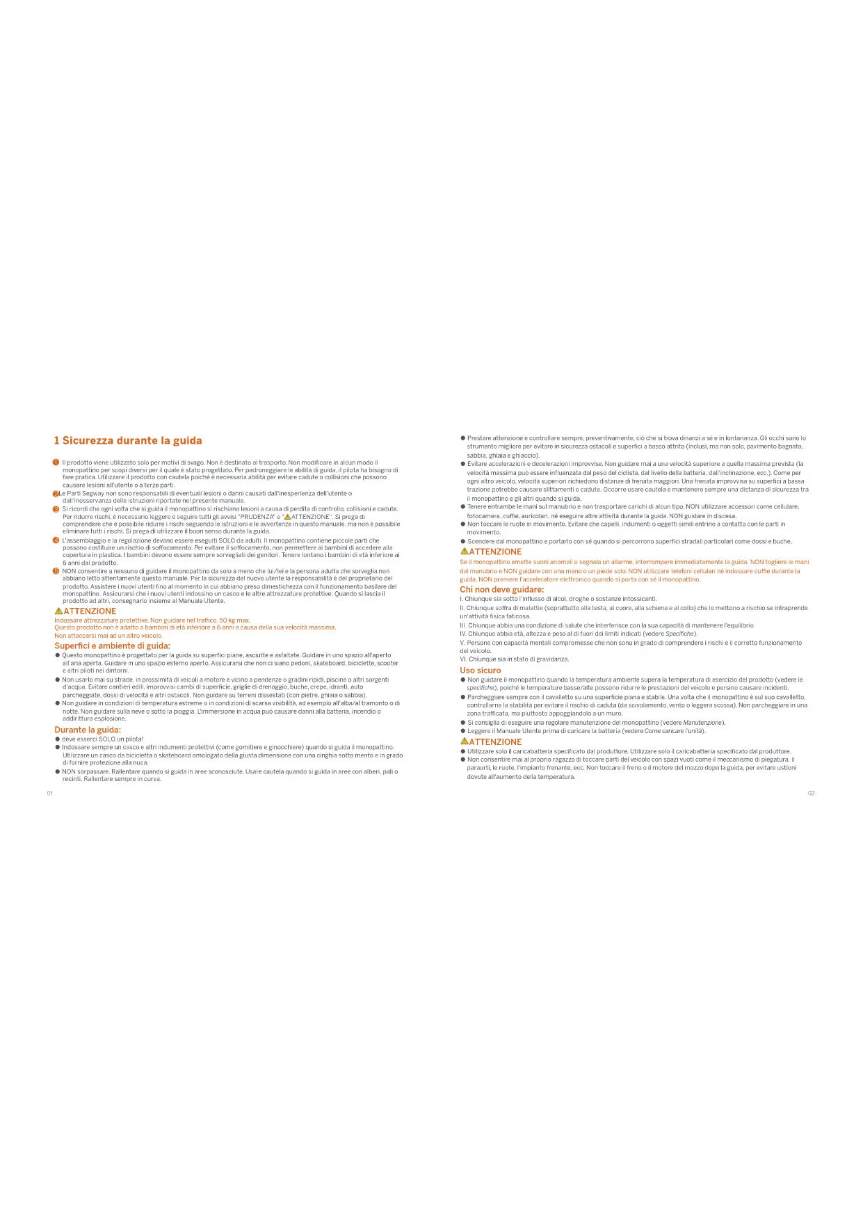 Uso sicuro ● Non guidare il monopattino quando la temperatura ambiente supera la temperatura di esercizio del prodotto (vedere le specifiche), poiché le temperature basse/alte possono ridurre le prestazioni del veicolo e persino causare incidenti. ● Parcheggiare sempre con il cavalletto su una superficie piana e stabile. Una volta che il monopattino è sul suo cavalletto, controllarne la stabilità per evitare il rischio di caduta (da scivolamento, vento o leggera scossa). Non parcheggiare in una zona trafficata, ma piuttosto appoggiandolo a un muro. ● Si consiglia di eseguire una regolare manutenzione del monopattino (vedere Manutenzione). ● Leggere il Manuale Utente prima di caricare la batteria (vedere Come caricare l’unità). ATTENZIONE ● Utilizzare solo il caricabatteria specificato dal produttore. Utilizzare solo il caricabatteria specificato dal produttore. ● Non consentire mai al proprio ragazzo di toccare parti del veicolo con spazi vuoti come il meccanismo di piegatura, il paraurti, le ruote, l'impianto frenante, ecc. Non toccare il freno o il motore del mozzo dopo la guida, per evitare ustioni dovute all'aumento della temperatura. 1 Sicurezza durante la guida Il prodotto viene utilizzato solo per motivi di svago. Non è destinato al trasporto. Non modificare in alcun modo il monopattino per scopi diversi per il quale è stato progettato. Per padroneggiare le abilità di guida, il pilota ha bisogno di fare pratica. Utilizzare il prodotto con cautela poiché è necessaria abilità per evitare cadute o collisioni che possono causare lesioni all'utente o a terze parti. Le Parti Segway non sono responsabili di eventuali lesioni o danni causati dall'inesperienza dell’utente o dall'inosservanza delle istruzioni riportate nel presente manuale. Si ricordi che ogni volta che si guida il monopattino si rischiano lesioni a causa di perdita di controllo, collisioni e cadute. Per ridurre rischi, è necessario leggere e seguire tutti gli avvisi "PRUDENZA" e " ATTENZIONE". Si prega di comprendere che è possibile ridurre i rischi seguendo le istruzioni e le avvertenze in questo manuale, ma non è possibile eliminare tutti i rischi. Si prega di utilizzare il buon senso durante la guida. L'assemblaggio e la regolazione devono essere eseguiti SOLO da adulti. Il monopattino contiene piccole parti che possono costituire un rischio di soffocamento. Per evitare il soffocamento, non permettere ai bambini di accedere alla copertura in plastica. I bambini devono essere sempre sorvegliati dei genitori. Tenere lontano i bambini di età inferiore ai 6 anni dal prodotto. NON consentire a nessuno di guidare il monopattino da solo a meno che lui/lei e la persona adulta che sorveglia non abbiano letto attentamente questo manuale. Per la sicurezza del nuovo utente la responsabilità è del proprietario del prodotto. Assistere i nuovi utenti fino al momento in cui abbiano preso dimestichezza con il funzionamento basilare del monopattino. Assicurarsi che i nuovi utenti indossino un casco e le altre attrezzature protettive. Quando si lascia il prodotto ad altri, consegnarlo insieme al Manuale Utente. ATTENZIONE Indossare attrezzature protettive. Non guidare nel traffico. 50 kg max. Questo prodotto non è adatto a bambini di età inferiore a 6 anni a causa della sua velocità massima. Non attaccarsi mai ad un altro veicolo. Superfici e ambiente di guida: ● Questo monopattino è progettato per la guida su superfici piane, asciutte e asfaltate. Guidare in uno spazio all'aperto all'aria aperta. Guidare in uno spazio esterno aperto. Assicurarsi che non ci siano pedoni, skateboard, biciclette, scooter e altri piloti nei dintorni. ● Non usarlo mai su strade, in prossimità di veicoli a motore e vicino a pendenze o gradini ripidi, piscine o altri sorgenti d'acqua. Evitare cantieri edili, improvvisi cambi di superficie, griglie di drenaggio, buche, crepe, idranti, auto parcheggiate, dossi di velocità e altri ostacoli. Non guidare su terreni dissestati (con pietre, ghiaia o sabbia). ● Non guidare in condizioni di temperatura estreme o in condizioni di scarsa visibilità, ad esempio all'alba/al tramonto o di notte. Non guidare sulla neve o sotto la pioggia. L'immersione in acqua può causare danni alla batteria, incendio o addirittura esplosione. Durante la guida: ● deve esserci SOLO un pilota! ● Indossare sempre un casco e altri indumenti protettivi (come gomitiere e ginocchiere) quando si guida il monopattino. Utilizzare un casco da bicicletta o skateboard omologato della giusta dimensione con una cinghia sotto mento e in grado di fornire protezione alla nuca. ● NON sorpassare. Rallentare quando si guida in aree sconosciute. Usare cautela quando si guida in aree con alberi, pali o recinti. Rallentare sempre in curva.