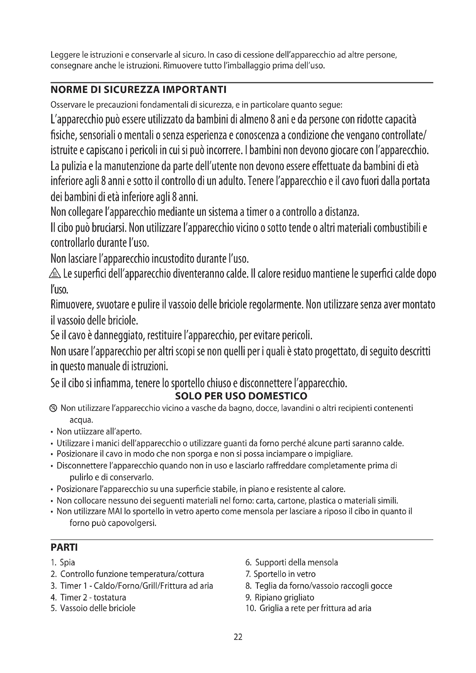 Le superci dell’apparecchio diventeranno calde. Il calore residuo mantiene le superci calde dopo l’uso. Rimuovere, svuotare e pulire il vassoio delle briciole regolarmente. Non utilizzare senza aver montato il vassoio delle briciole. Se il cavo è danneggiato, restituire l’apparecchio, per evitare pericoli. Non usare l’apparecchio per altri scopi se non quelli per i quali è stato progettato, di seguito descritti in questo manuale di istruzioni. Se il cibo si inamma, tenere lo sportello chiuso e disconnettere l’apparecchio.