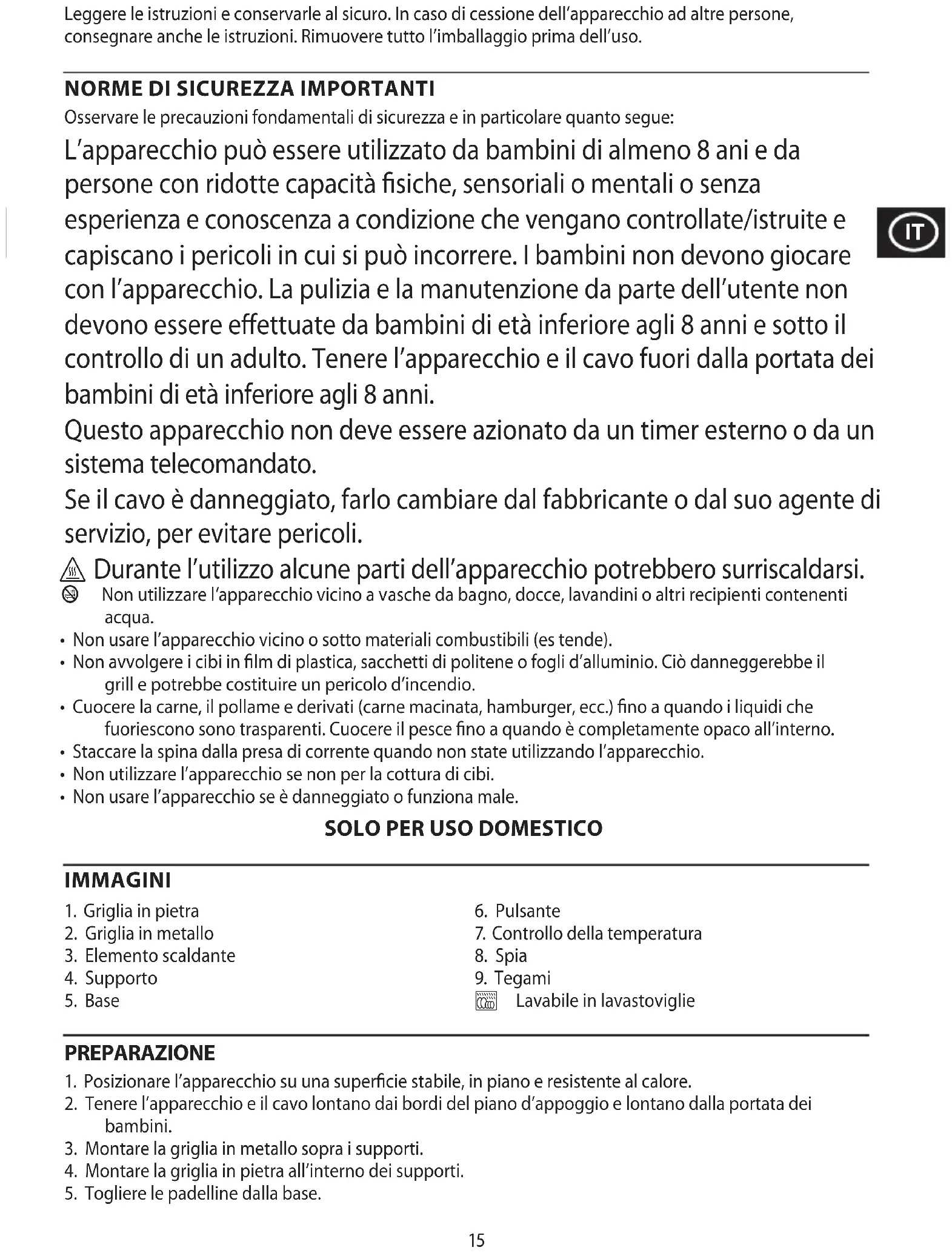 Osservare le precauzioni fondamentali di sicurezza e in particolare quanto segue: L’apparecchio può essere utilizzato da bambini di almeno 8 ani e da persone con ridotte capacità fisiche, sensoriali o mentali o senza esperienza e conoscenza a condizione che vengano controllate/istruite e capiscano i pericoli in cui si può incorrere. I bambini non devono giocare con l’apparecchio. La pulizia e la manutenzione da parte dell’utente non devono essere effettuate da bambini di età inferiore agli 8 anni e sotto il controllo di un adulto. Tenere l’apparecchio e il cavo fuori dalla portata dei bambini di età inferiore agli 8 anni. Questo apparecchio non deve essere azionato da un timer esterno o da un sistema telecomandato. Se il cavo è danneggiato, farlo cambiare dal fabbricante o dal suo agente di servizio, per evitare pericoli.