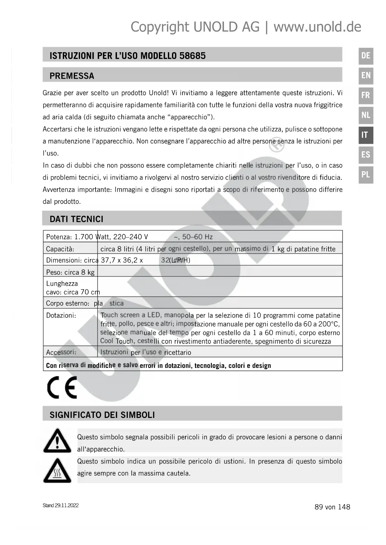 Questo simbolo segnala possibili pericoli in grado di provocare lesioni a persone o danni all‘apparecchio. Questo simbolo indica un possibile pericolo di ustioni. In presenza di questo simbolo agire sempre con la massima cautela. Potenza: 1.700 Watt, 220–240 V~, 50–60 Hz Capacità: circa 8 litri (4 litri per ogni cestello), per un massimo di 1 kg di patatine fritte Dimensioni: circa 37,7 x 36,2 x 32 cm (L/P/H) Peso: circa 8 kg Lunghezza cavo: circa 70 cm Corpo esterno: plastica Dotazioni: Touch screen a LED, manopola per la selezione di 10 programmi come patatine fritte, pollo, pesce e altri; impostazione manuale per ogni cestello da 60 a 200°C, selezione manuale del tempo per ogni cestello da 1 a 60 minuti, corpo esterno Cool Touch, cestelli con rivestimento antiaderente, spegnimento di sicurezza Accessori: Istruzioni per l’uso e ricettario Con riserva di modifiche e salvo errori in dotazioni, tecnologia, colori e design Copyright UNOLD AG | www.unold.de90 von 148 Stand 29.11.2022
