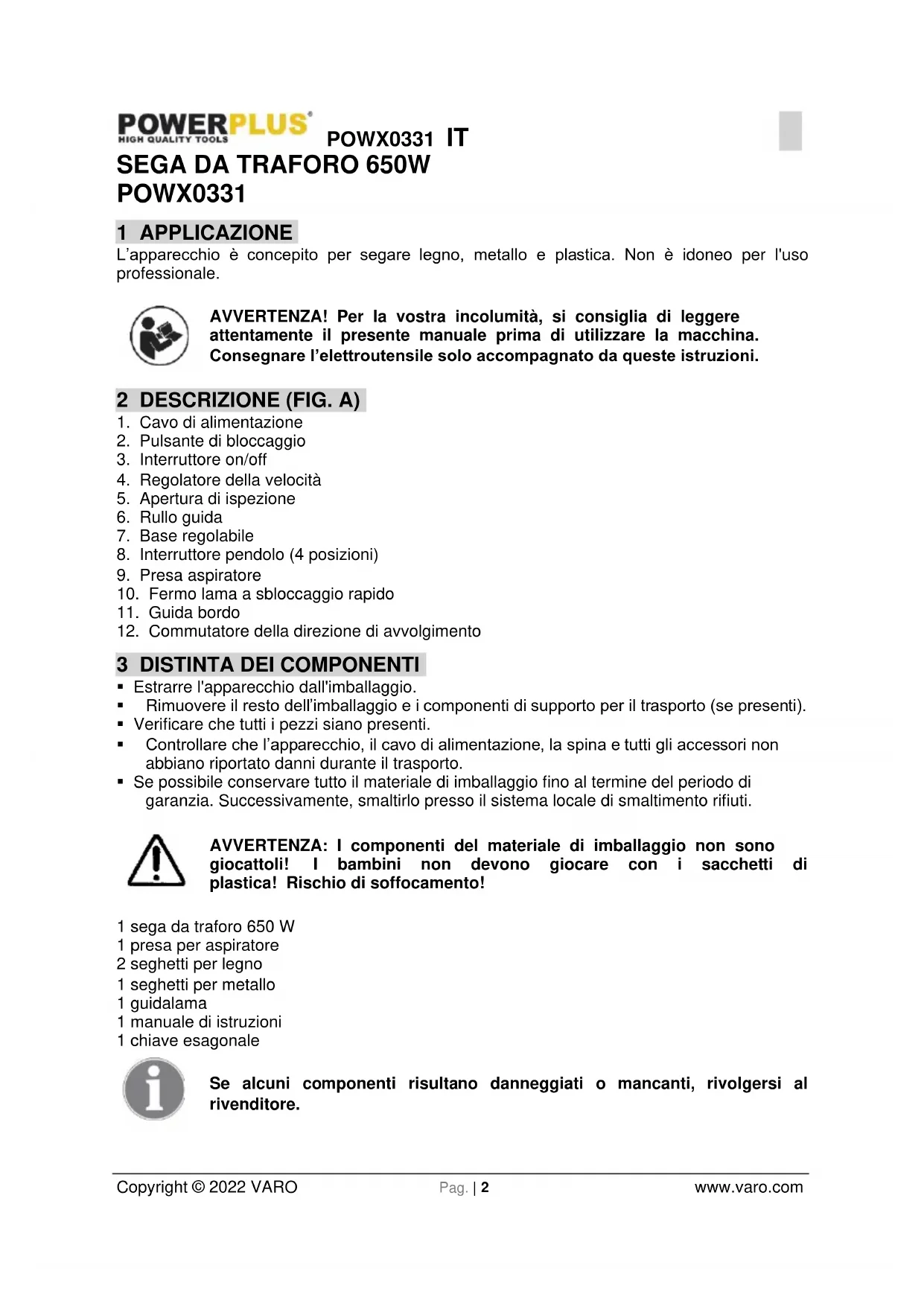 POWX0331 1 APPLICAZIONE L’apparecchio è concepito per segare legno, metallo e plastica. Non è idoneo per l'uso professionale. AVVERTENZA! Per la vostra incolumità, si consiglia di leggere attentamente il presente manuale prima di utilizzare la macchina. Consegnare l’elettroutensile solo accompagnato da queste istruzioni. 2 DESCRIZIONE (FIG. A)