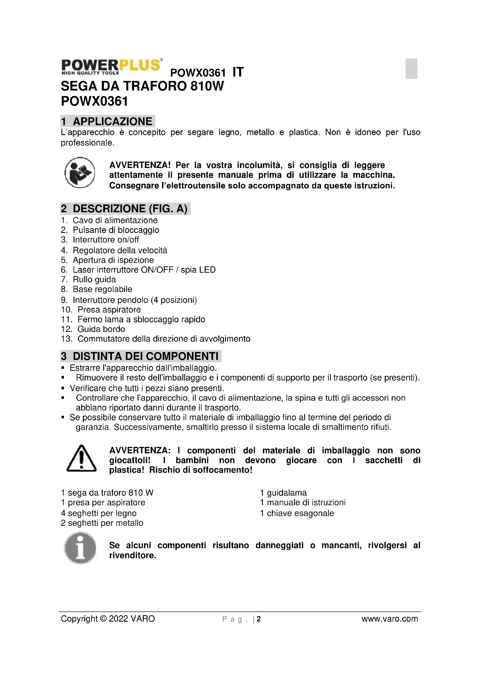 POWX0361 1 APPLICAZIONE L’apparecchio è concepito per segare legno, metallo e plastica. Non è idoneo per l'uso professionale. AVVERTENZA! Per la vostra incolumità, si consiglia di leggere attentamente il presente manuale prima di utilizzare la macchina. Consegnare l’elettroutensile solo accompagnato da queste istruzioni. 2 DESCRIZIONE (FIG. A)
