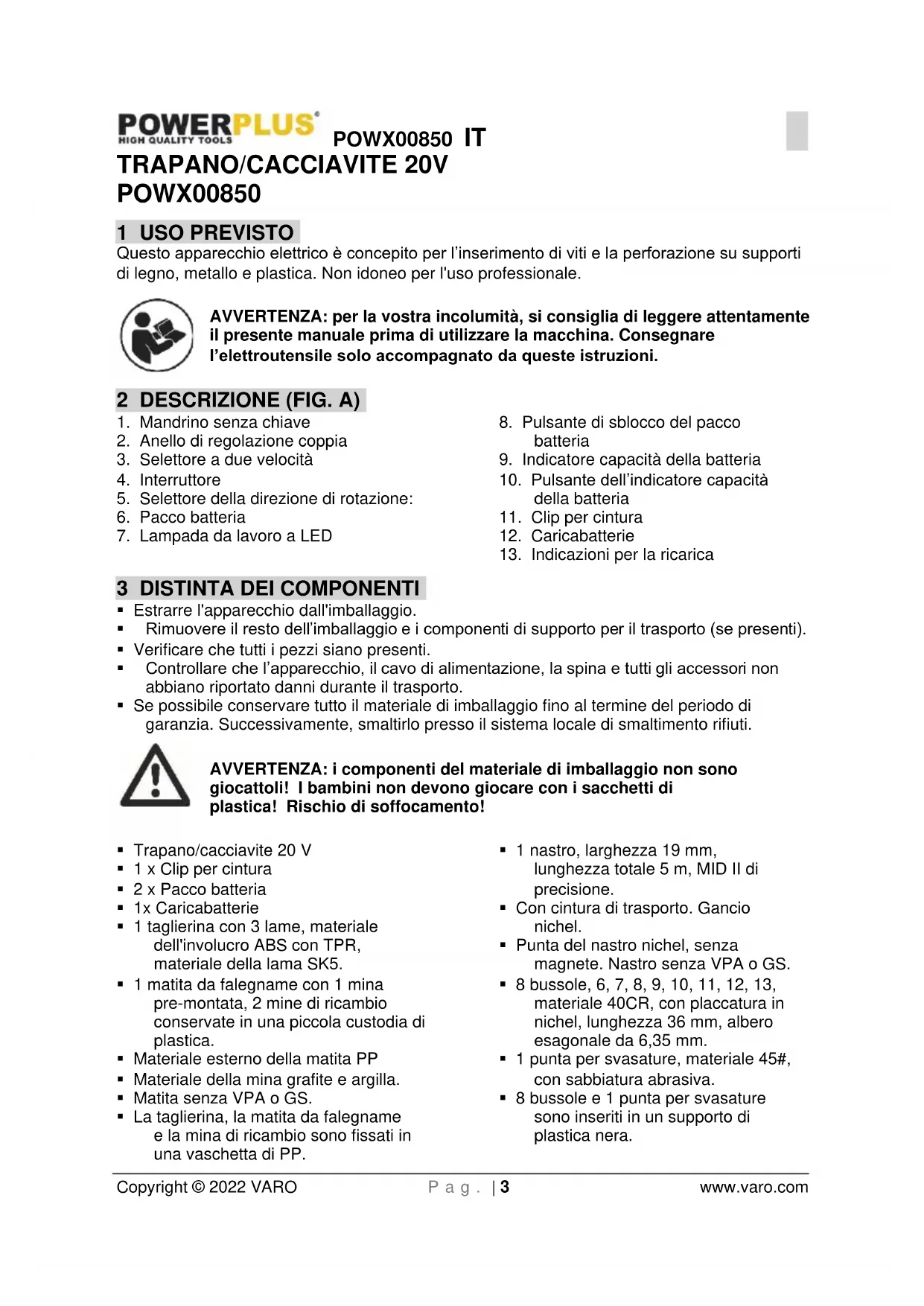 - Prima di avviare l’apparecchio, rimuovere gli utensili di regolazione o la chiave per dadi. Un utensile o una chiave che si trovino in una sezione rotante possono causare lesioni.POWX00850 IT Copyright © 2022 VARO P a g . | 6 www.varo.com