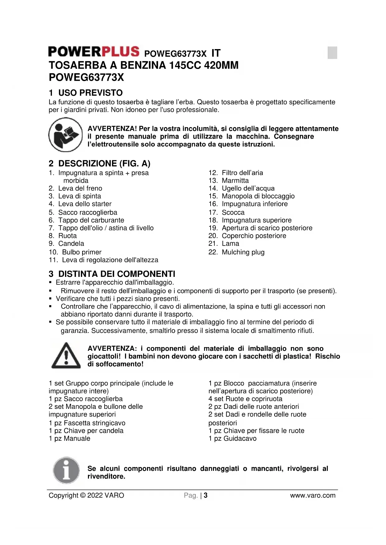 - Se possibile conservare tutto il materiale di imballaggio fino al termine del periodo di garanzia. Successivamente, smaltirlo presso il sistema locale di smaltimento rifiuti. AVVERTENZA: i componenti del materiale di imballaggio non sono giocattoli! I bambini non devono giocare con i sacchetti di plastica! Rischio di soffocamento! 1 set Gruppo corpo principale (include le impugnature intere) 1 pz Sacco raccoglierba 2 set Manopola e bullone delle impugnature superiori 1 pz Fascetta stringicavo 1 pz Chiave per candela 1 pz Manuale 1 pz Blocco pacciamatura (inserire nell’apertura di scarico posteriore) 4 set Ruote e copriruota 2 pz Dadi delle ruote anteriori 2 set Dadi e rondelle delle ruote posteriori 1 pz Chiave per fissare le ruote 1 pz Guidacavo Se alcuni componenti risultano danneggiati o mancanti, rivolgersi al rivenditore.POWEG63773X IT Copyright © 2022 VARO Pag. | 4 www.varo.com 4 SIMBOLI Nel presente manuale e/o sull’apparecchio sono utilizzati i seguenti simboli: