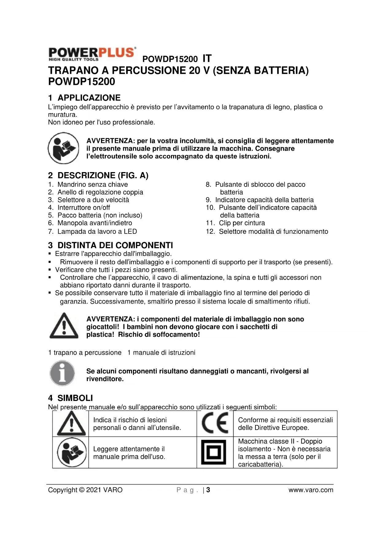 Macchina classe II - Doppio isolamento - Non è necessaria la messa a terra (solo per il caricabatteria).POWDP15200 IT Copyright © 2021 VARO P a g . | 4 www.varo.com