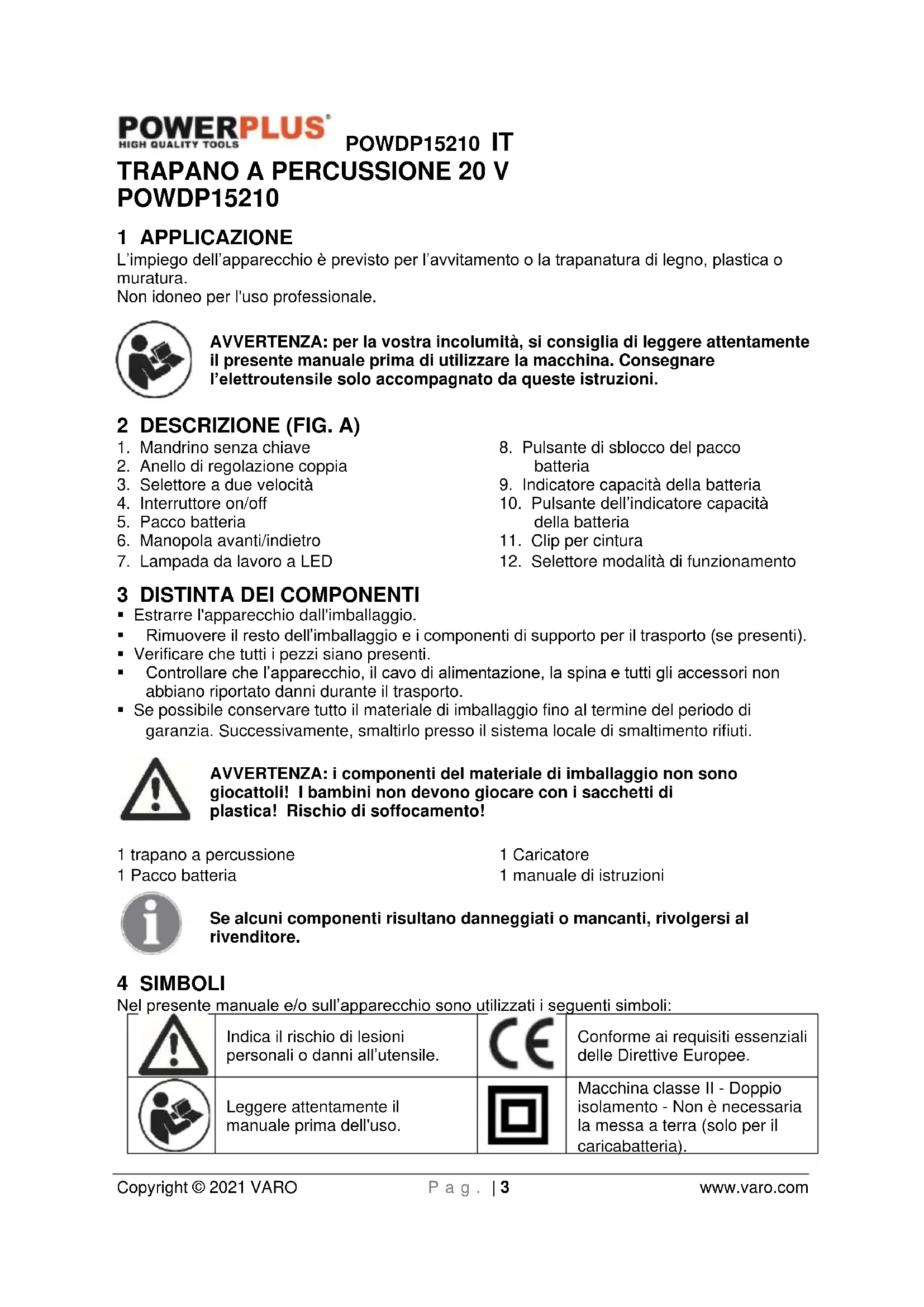 Macchina classe II - Doppio isolamento - Non è necessaria la messa a terra (solo per il caricabatteria).POWDP15210 IT Copyright © 2021 VARO P a g . | 4 www.varo.com