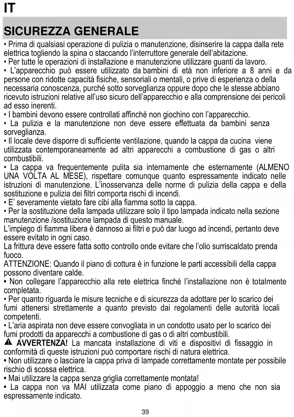 - Prima di qualsiasi operazione di pulizia o manutenzione, disinserire la cappa dalla rete elettrica togliendo la spina o staccando l’interruttore generale dell’abitazione.