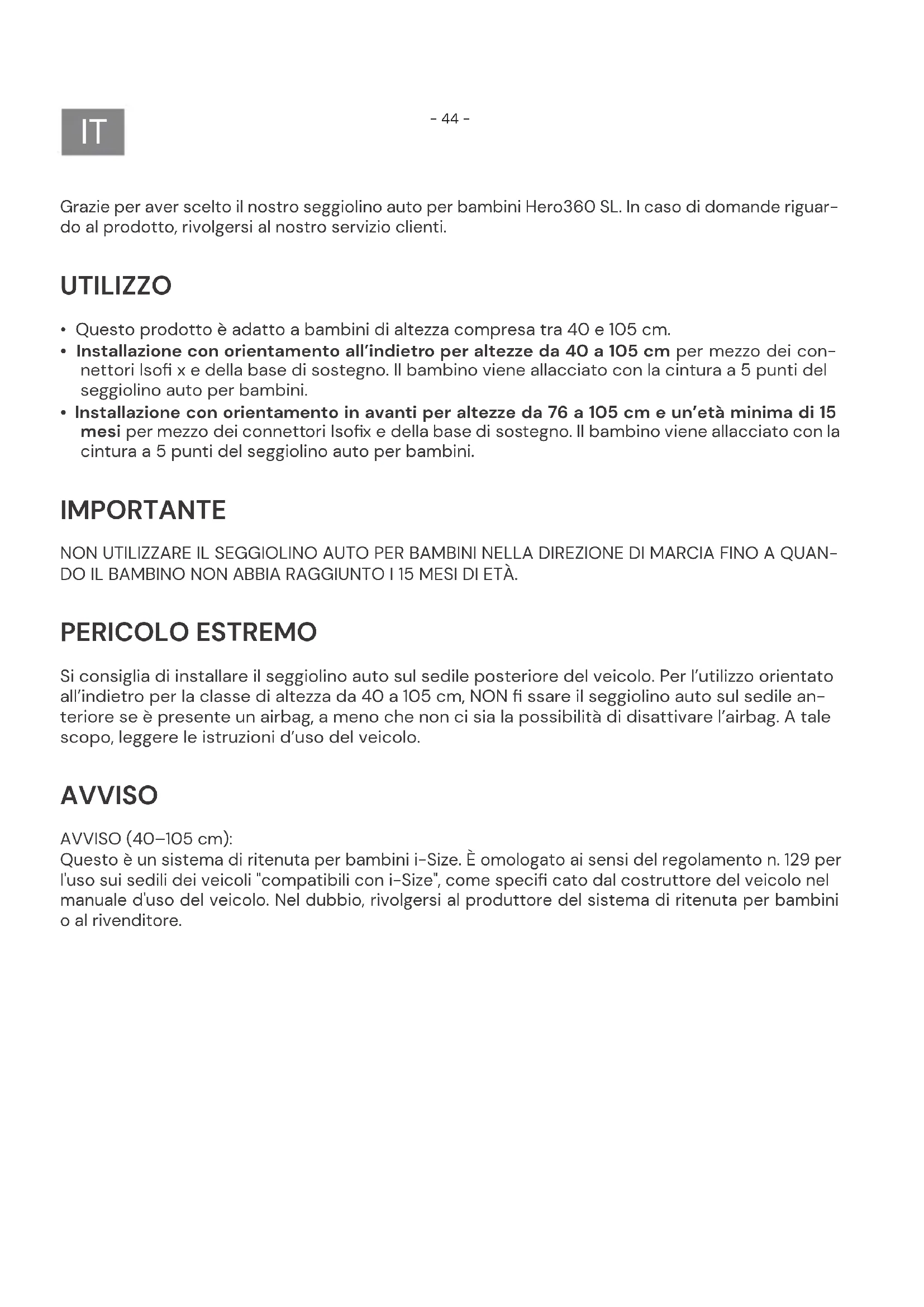 Grazie per aver scelto il nostro seggiolino auto per bambini Hero360 SL. In caso di domande riguar- do al prodotto, rivolgersi al nostro servizio clienti. UTILIZZO