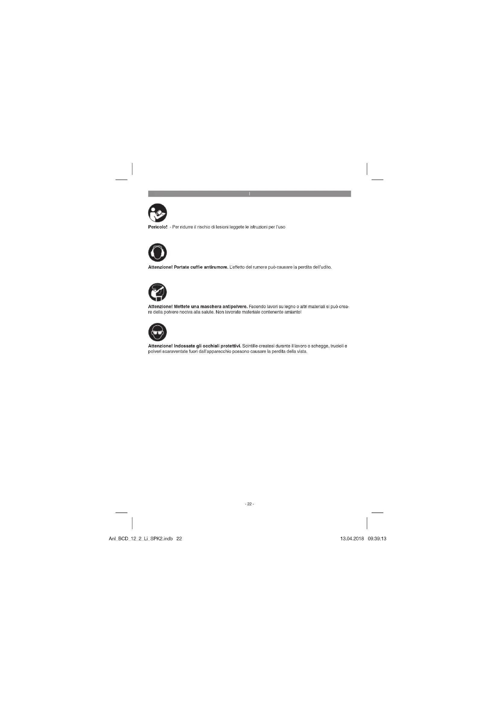 Pericolo! - Per ridurre il rischio di lesioni leggete le istruzioni per l’uso Attenzione! Portate cuffi e antirumore. L’ e ff etto del rumore può causare la perdita dell’udito. Attenzione! Indossate gli occhiali protettivi. Scintille createsi durante il lavoro o schegge, trucioli e polveri scaraventate fuori dall’apparecchio possono causare la perdita della vista. Attenzione! Mettete una maschera antipolvere. Facendo lavori su legno o altri materiali si può crea- re della polvere nociva alla salute. Non lavorate materiale contenente amianto! Anl_BCD_12_2_Li_SPK2.indb 22Anl_BCD_12_2_Li_SPK2.indb 22 13.04.2018 09:39:1313.04.2018 09:39:13I