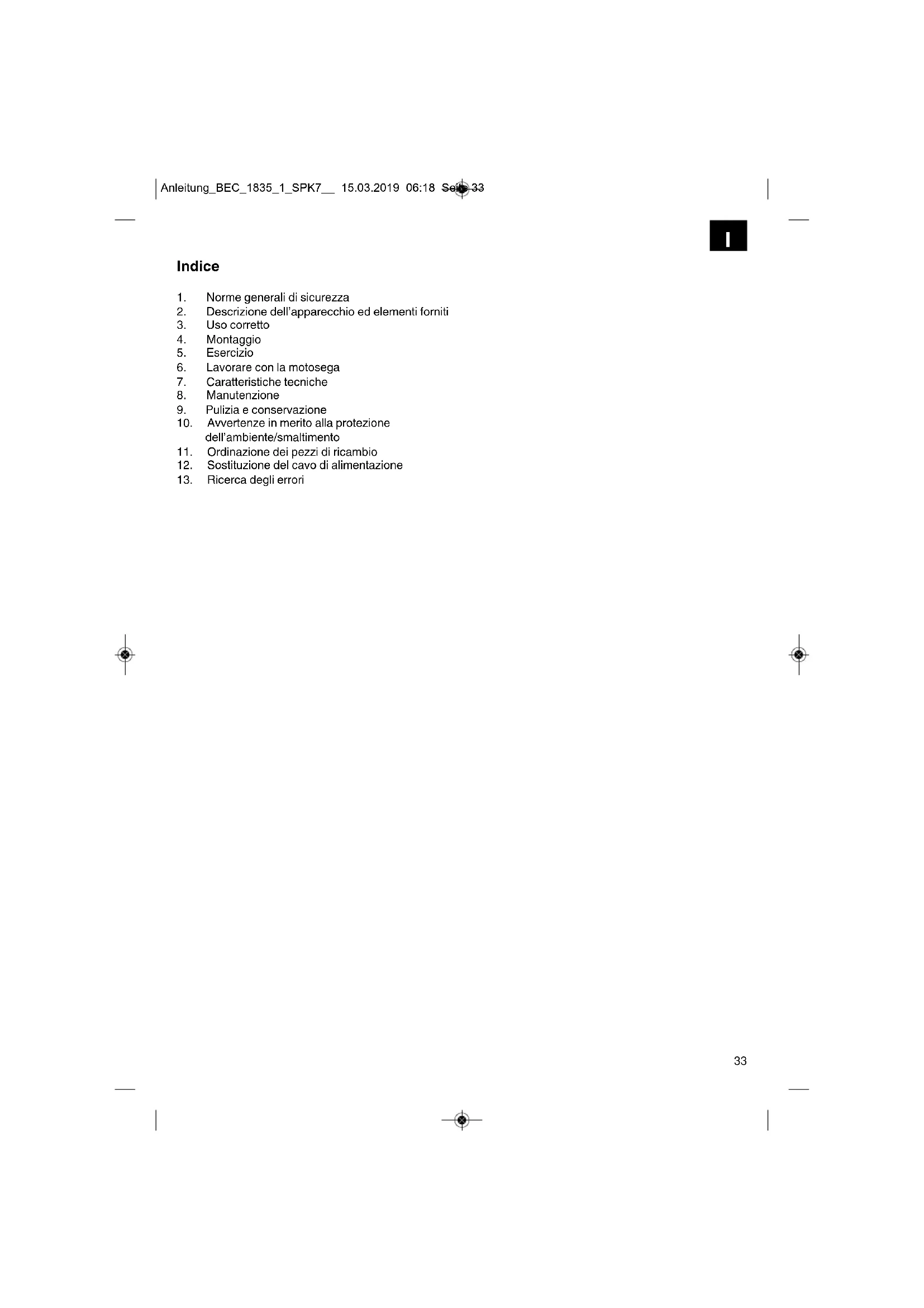 Accensione n Tenete la motosega con ambedue le mani sulle impugnature con indicato nella Fig. 11 (pollice sotto l’impugnatura). n Premete la sicura (Fig. 1/Pos. 5) e tenetela premuta. n Accendete la motosega con l’interruttore ON/OFF. Ora potete mollare la sicura. Spegnimento Mollate l’interruttore ON/OFF (Fig. 1/Pos. 6) Il freno incorporato ferma la catena della sega in brevissimo tempo. Staccate sempre la spina dalla presa di corrente se interrompete il lavoro. Avvertenza! Tenete la sega solo con l’impugnatura anteriore. Se tenete la sega collegata all’alimentazione di corrente solo per l’impugnatura posteriore con gli elementi di comando, può succedere che azioniate contemporaneamente la sicura e l’interruttore di ON/OFF e che la motosega si avvii. Anleitung_BEC_1835_1_SPK7__ 15.03.2019 06:18 Seite 35I