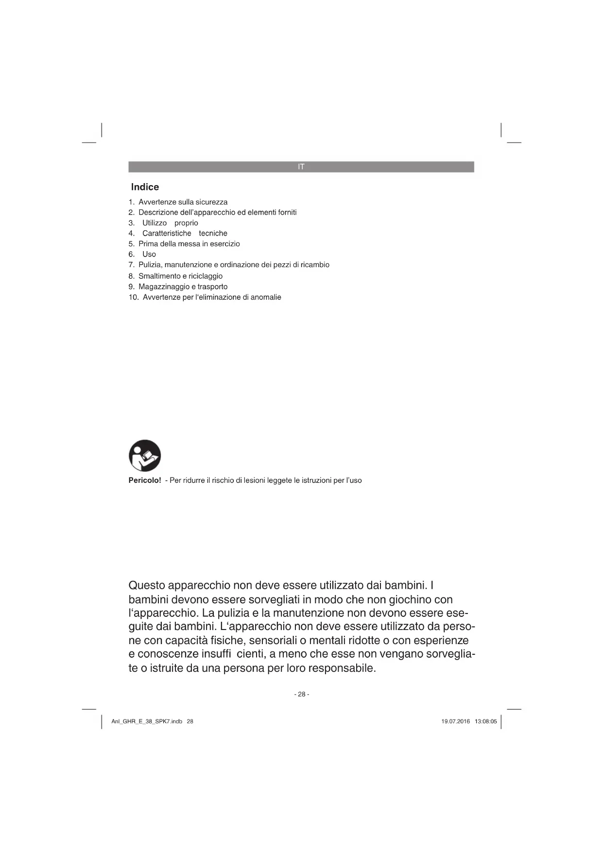 Questo apparecchio non deve essere utilizzato dai bambini. I bambini devono essere sorvegliati in modo che non giochino con l‘apparecchio. La pulizia e la manutenzione non devono essere ese- guite dai bambini. L‘apparecchio non deve essere utilizzato da perso- ne con capacità fi siche, sensoriali o mentali ridotte o con esperienze e conoscenze insuffi cienti, a meno che esse non vengano sorveglia- te o istruite da una persona per loro responsabile. Pericolo! - Per ridurre il rischio di lesioni leggete le istruzioni per l’uso Anl_GHR_E_38_SPK7.indb 28Anl_GHR_E_38_SPK7.indb 28 19.07.2016 13:08:0519.07.2016 13:08:05IT