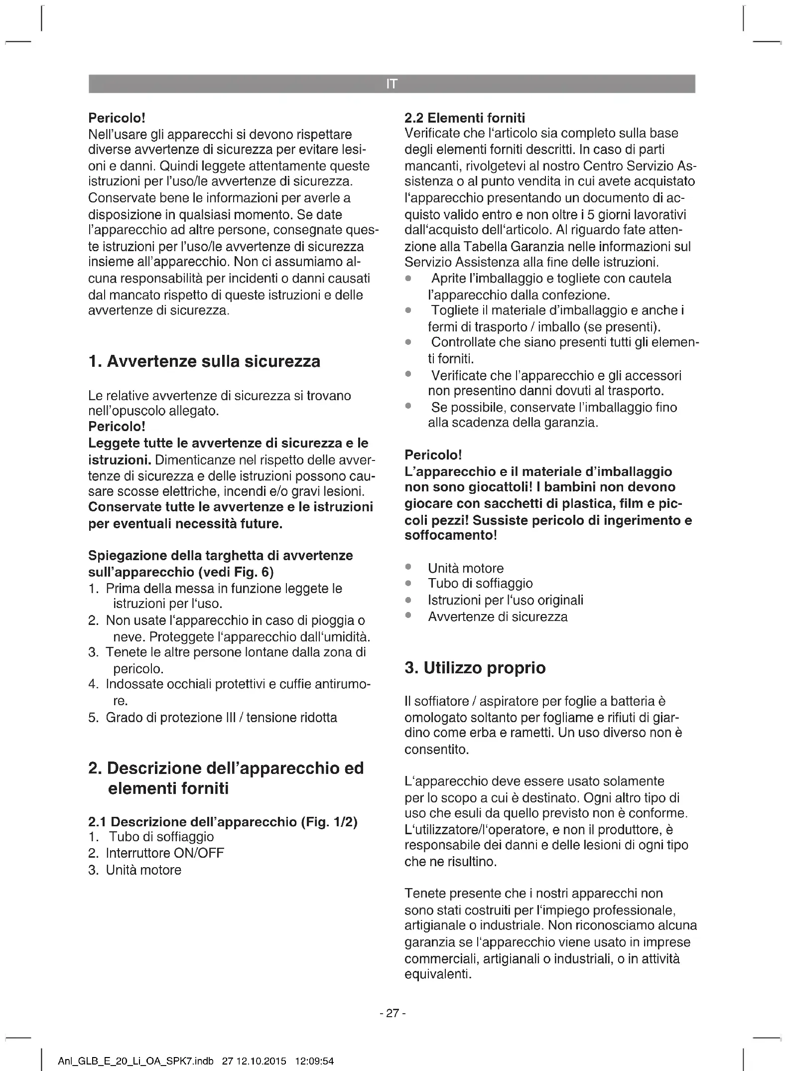 Il soatore / aspiratore per foglie a batteria è omologato soltanto per fogliame e riuti di giar- dino come erba e rametti. Un uso diverso non è consentito. L‘apparecchio deve essere usato solamente per lo scopo a cui è destinato. Ogni altro tipo di uso che esuli da quello previsto non è conforme. L‘utilizzatore/l‘operatore, e non il produttore, è responsabile dei danni e delle lesioni di ogni tipo che ne risultino. Tenete presente che i nostri apparecchi non sono stati costruiti per l‘impiego professionale, artigianale o industriale. Non riconosciamo alcuna garanzia se l‘apparecchio viene usato in imprese commerciali, artigianali o industriali, o in attività equivalenti. Anl_GLB_E_20_Li_OA_SPK7.indb 27 12.10.2015 12:09:54IT