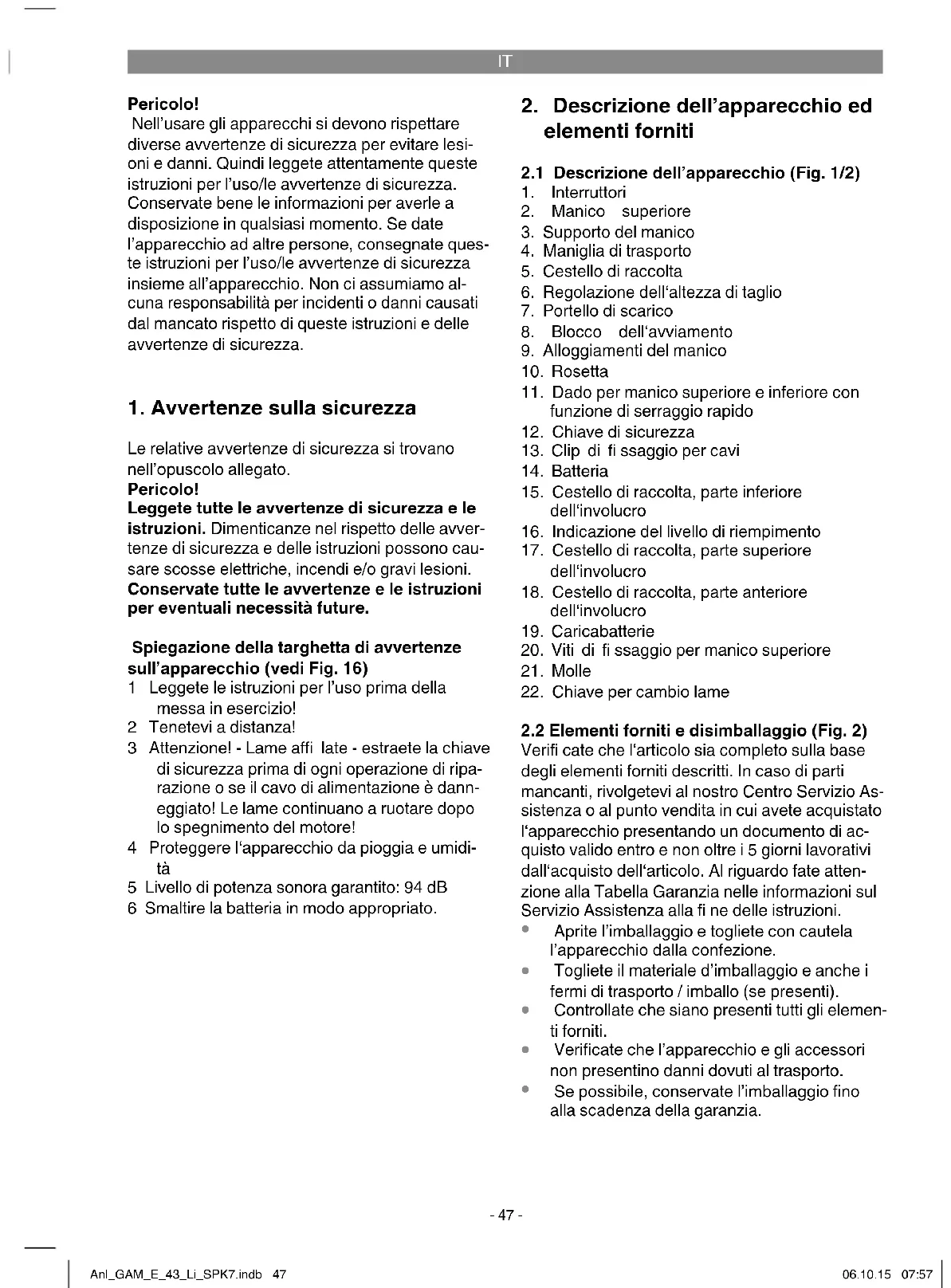 Con le clip di fissaggio per cavi fissate il cavo lungo il manico di guida (Fig. 7/Pos. A). Montaggio del cestello di raccolta (vedi Fig. da 8 a 10) Unite prima la parte inferiore dell‘involucro (Fig. 2/Pos. 15) con la parte anteriore (Fig. 2/Pos. 18) come indicato nella Fig. 8. Poi montate la parte superiore dell‘involucro (Fig. 2/Pos. 17) sulle due metà già montate (Fig. 9). Per agganciare il cestello di raccolta si deve spegnere il mo- tore e la lama non deve ruotare. Sollevate con una mano il portello di scarico (Fig. 10/Pos. A). Con l‘altra mano tenete il cestello di raccolta sull‘impugnatura e agganciatelo dall‘alto (Fig. 10). Indicazione del livello di riempimento del dis- positivo di raccolta Il dispositivo di raccolta è dotato di un‘indicazione di livello (Fig. 2/Pos. 16), che viene aperta dal fl usso d‘aria che il tagliaerba genera quando è in esercizio. Se durante il taglio il portello si chiude, il dispositivo di raccolta è pieno e dovrebbe esse- re svuotato. I fori sotto il portello devono essere sempre puliti e liberi perché l‘indicazione di livello funzioni correttamente. Regolazione dell’altezza di taglio Attenzione! La regolazione dell‘altezza di taglio deve venire eseguita solamente ad apparecchio spento e con la chiave di sicurezza staccata. Prima di iniziare a tagliare, verifi cate che le lame siano affi late e che i loro dispositivi di fi ssaggio non siano danneggiati. Sostituite le lame consu- mate e/o danneggiate per evitare sbilanciamenti. Durante questa verifi ca spegnete il motore ed estraete la chiave di sicurezza. Anl_GAM_E_43_Li_SPK7.indb 49Anl_GAM_E_43_Li_SPK7.indb 49 06.10.15 07:5706.10.15 07:57IT