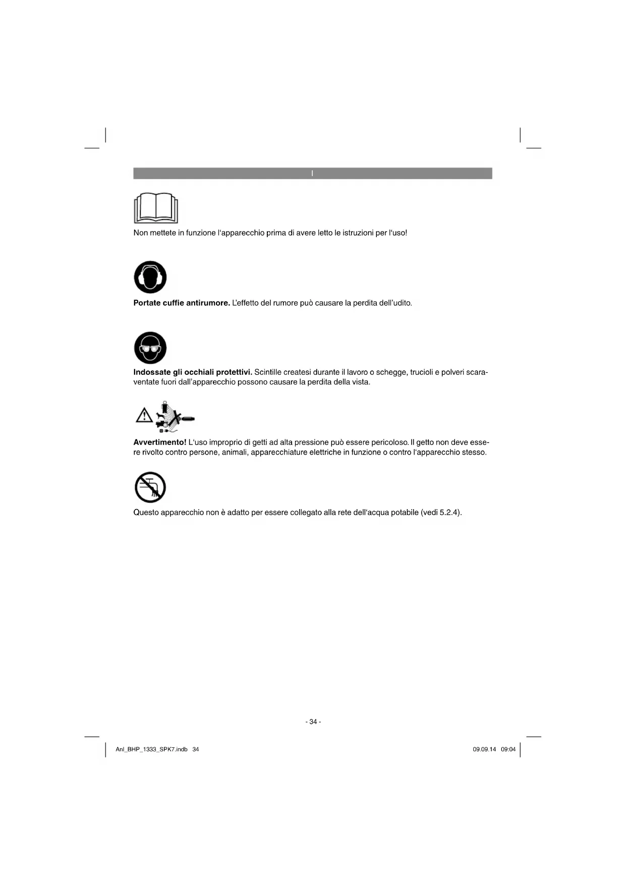 Portate cuffi e antirumore. L’e ff etto del rumore può causare la perdita dell’udito. Indossate gli occhiali protettivi. Scintille createsi durante il lavoro o schegge, trucioli e polveri scara- ventate fuori dall’apparecchio possono causare la perdita della vista. Non mettete in funzione l‘apparecchio prima di avere letto le istruzioni per l‘uso! Avvertimento! L‘uso improprio di getti ad alta pressione può essere pericoloso. Il getto non deve esse- re rivolto contro persone, animali, apparecchiature elettriche in funzione o contro l‘apparecchio stesso. Questo apparecchio non è adatto per essere collegato alla rete dell‘acqua potabile (vedi 5.2.4). Anl_BHP_1333_SPK7.indb 34Anl_BHP_1333_SPK7.indb 34 09.09.14 09:0409.09.14 09:04I