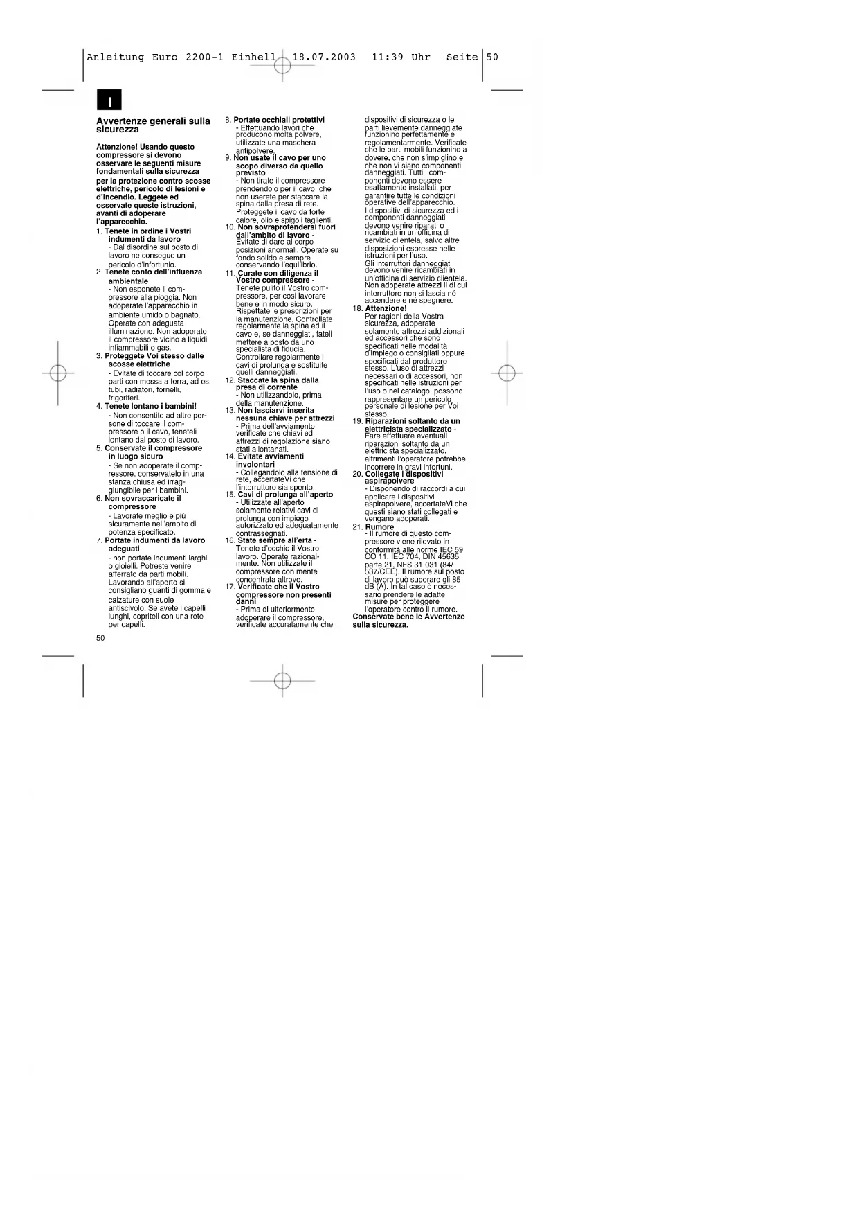 Anleitung Euro 2200-1 Einhell 18.07.2003 11:39 Uhr Seite 4950 Avvertenze generali sulla sicurezza Attenzione! Usando questo compressore si devono osservare le seguenti misure fondamentali sulla sicurezza per la protezione contro scosse elettriche, pericolo di lesioni e d’incendio. Leggete ed osservate queste istruzioni, avanti di adoperare l’apparecchio.
