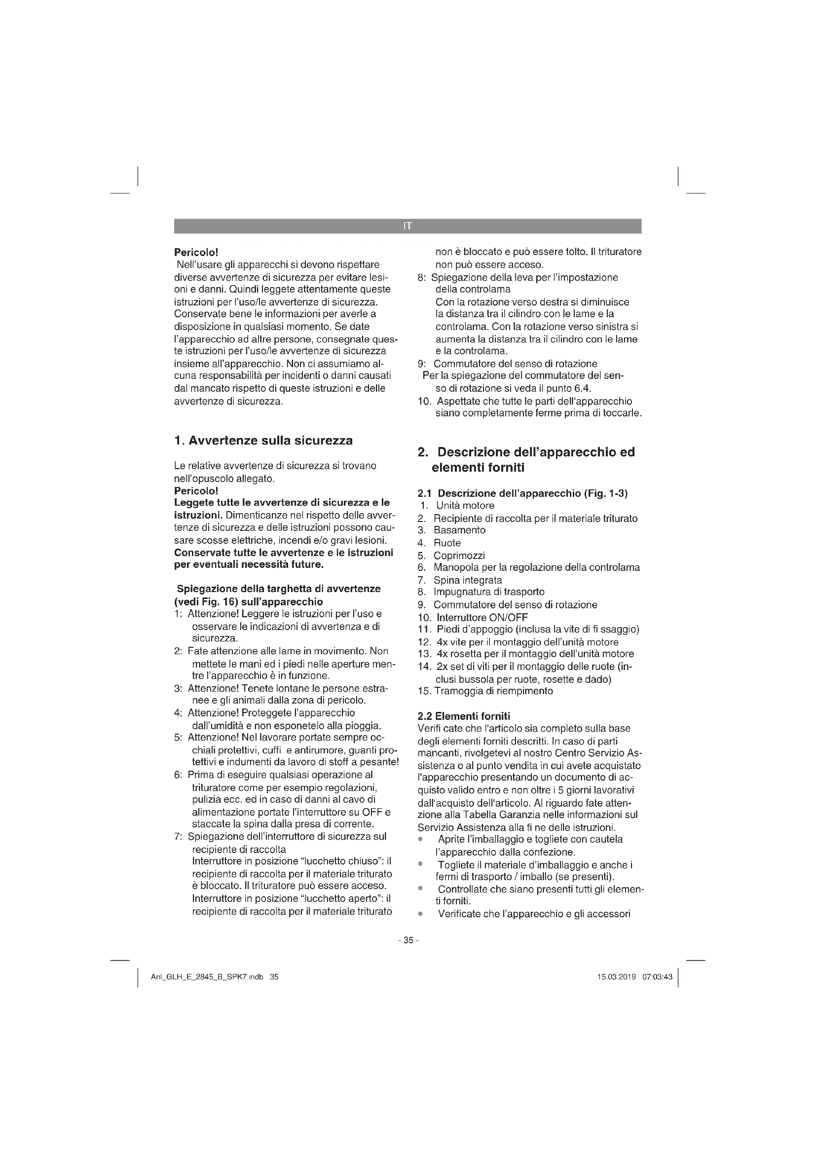 Le relative avvertenze di sicurezza si trovano nell’opuscolo allegato. Pericolo! Leggete tutte le avvertenze di sicurezza e le istruzioni. Dimenticanze nel rispetto delle avver- tenze di sicurezza e delle istruzioni possono cau- sare scosse elettriche, incendi e/o gravi lesioni. Conservate tutte le avvertenze e le istruzioni per eventuali necessità future. Spiegazione della targhetta di avvertenze (vedi Fig. 16) sull’apparecchio 1: Attenzione! Leggere le istruzioni per l’uso e osservare le indicazioni di avvertenza e di sicurezza. 2: Fate attenzione alle lame in movimento. Non mettete le mani ed i piedi nelle aperture men- tre l’apparecchio è in funzione. 3: Attenzione! Tenete lontane le persone estra- nee e gli animali dalla zona di pericolo. 4: Attenzione! Proteggete l’apparecchio dall’umidità e non esponetelo alla pioggia. 5: Attenzione! Nel lavorare portate sempre oc- chiali protettivi, cuffi e antirumore, guanti pro- tettivi e indumenti da lavoro di stoff a pesante! 6: Prima di eseguire qualsiasi operazione al trituratore come per esempio regolazioni, pulizia ecc. ed in caso di danni al cavo di alimentazione portate l’interruttore su OFF e staccate la spina dalla presa di corrente. 7: Spiegazione dell’interruttore di sicurezza sul recipiente di raccolta Interruttore in posizione “lucchetto chiuso”: il recipiente di raccolta per il materiale triturato è bloccato. Il trituratore può essere acceso. Interruttore in posizione “lucchetto aperto”: il recipiente di raccolta per il materiale triturato non è bloccato e può essere tolto. Il trituratore non può essere acceso. 8: Spiegazione della leva per l’impostazione della controlama Con la rotazione verso destra si diminuisce la distanza tra il cilindro con le lame e la controlama. Con la rotazione verso sinistra si aumenta la distanza tra il cilindro con le lame e la controlama. 9: Commutatore del senso di rotazione Per la spiegazione del commutatore del sen- so di rotazione si veda il punto 6.4.
