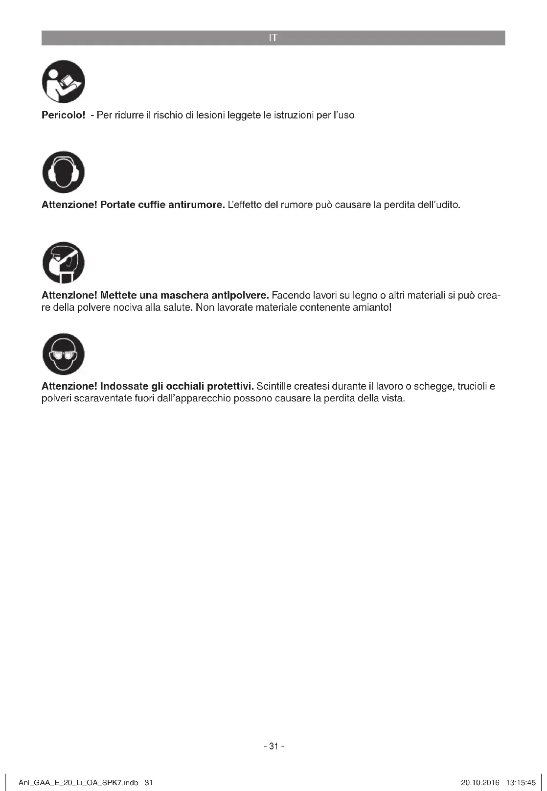 Pericolo! - Per ridurre il rischio di lesioni leggete le istruzioni per l’uso Attenzione! Portate cuffi e antirumore. L’e ff etto del rumore può causare la perdita dell’udito. Attenzione! Indossate gli occhiali protettivi. Scintille createsi durante il lavoro o schegge, trucioli e polveri scaraventate fuori dall’apparecchio possono causare la perdita della vista. Attenzione! Mettete una maschera antipolvere. Facendo lavori su legno o altri materiali si può crea- re della polvere nociva alla salute. Non lavorate materiale contenente amianto! Anl_GAA_E_20_Li_OA_SPK7.indb 31Anl_GAA_E_20_Li_OA_SPK7.indb 31 20.10.2016 13:15:4520.10.2016 13:15:45IT