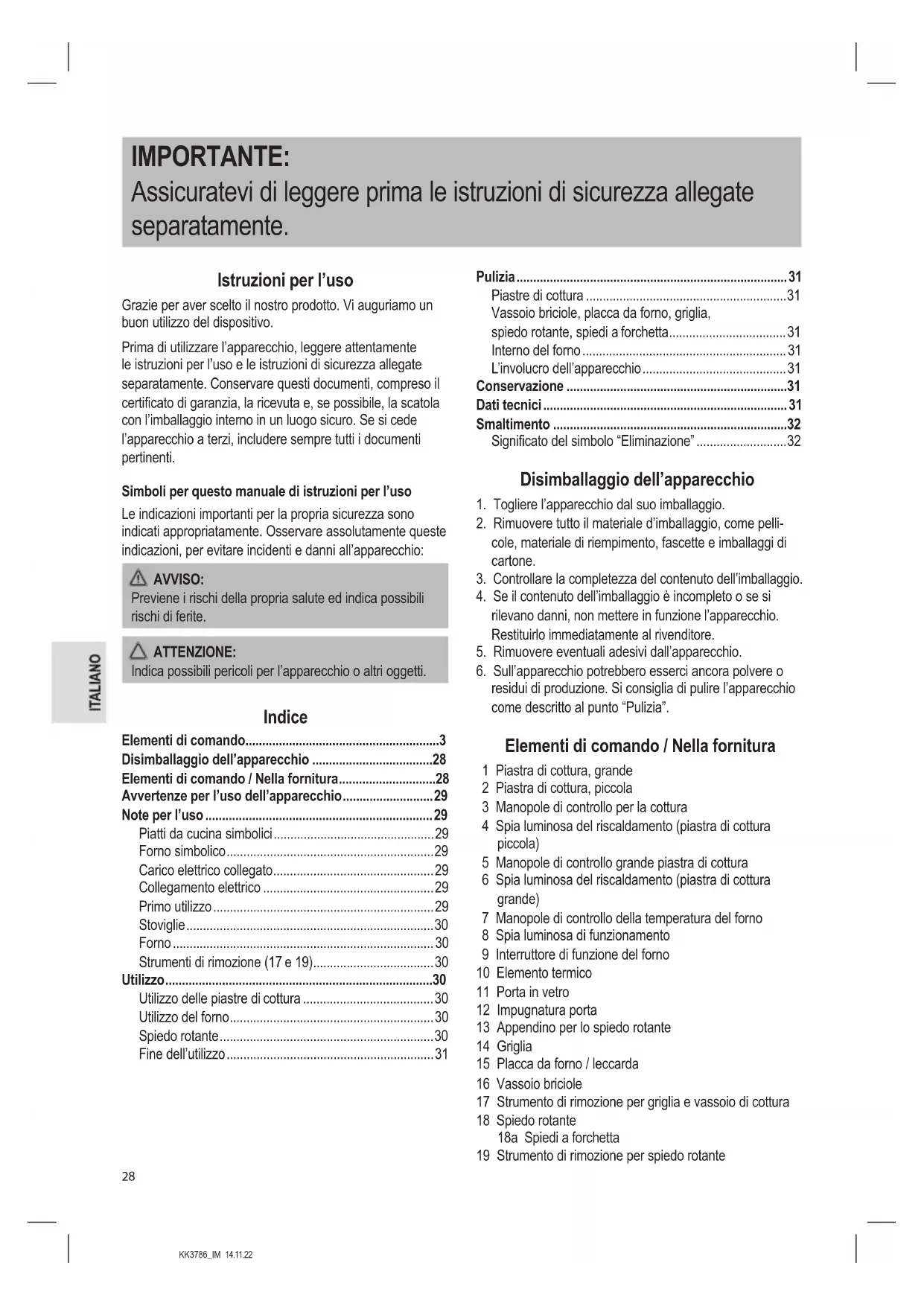 residui di produzione. Si consiglia di pulire l’apparecchio come descritto al punto “Pulizia”. Elementi di comando / Nella fornitura 1 Piastra di cottura, grande 2 Piastra di cottura, piccola 3 Manopole di controllo per la cottura 4 Spia luminosa del riscaldamento (piastra di cottura piccola) 5 Manopole di controllo grande piastra di cottura 6 Spia luminosa del riscaldamento (piastra di cottura grande) 7 Manopole di controllo della temperatura del forno 8 Spia luminosa di funzionamento 9 Interruttore di funzione del forno 10 Elemento termico 11 Porta in vetro 12 Impugnatura porta 13 Appendino per lo spiedo rotante 14 Griglia 15 Placca da forno / leccarda 16 Vassoio briciole 17 Strumento di rimozione per griglia e vassoio di cottura 18 Spiedo rotante 18a Spiedi a forchetta 19 Strumento di rimozione per spiedo rotanteKK3786_IM 14.11.22