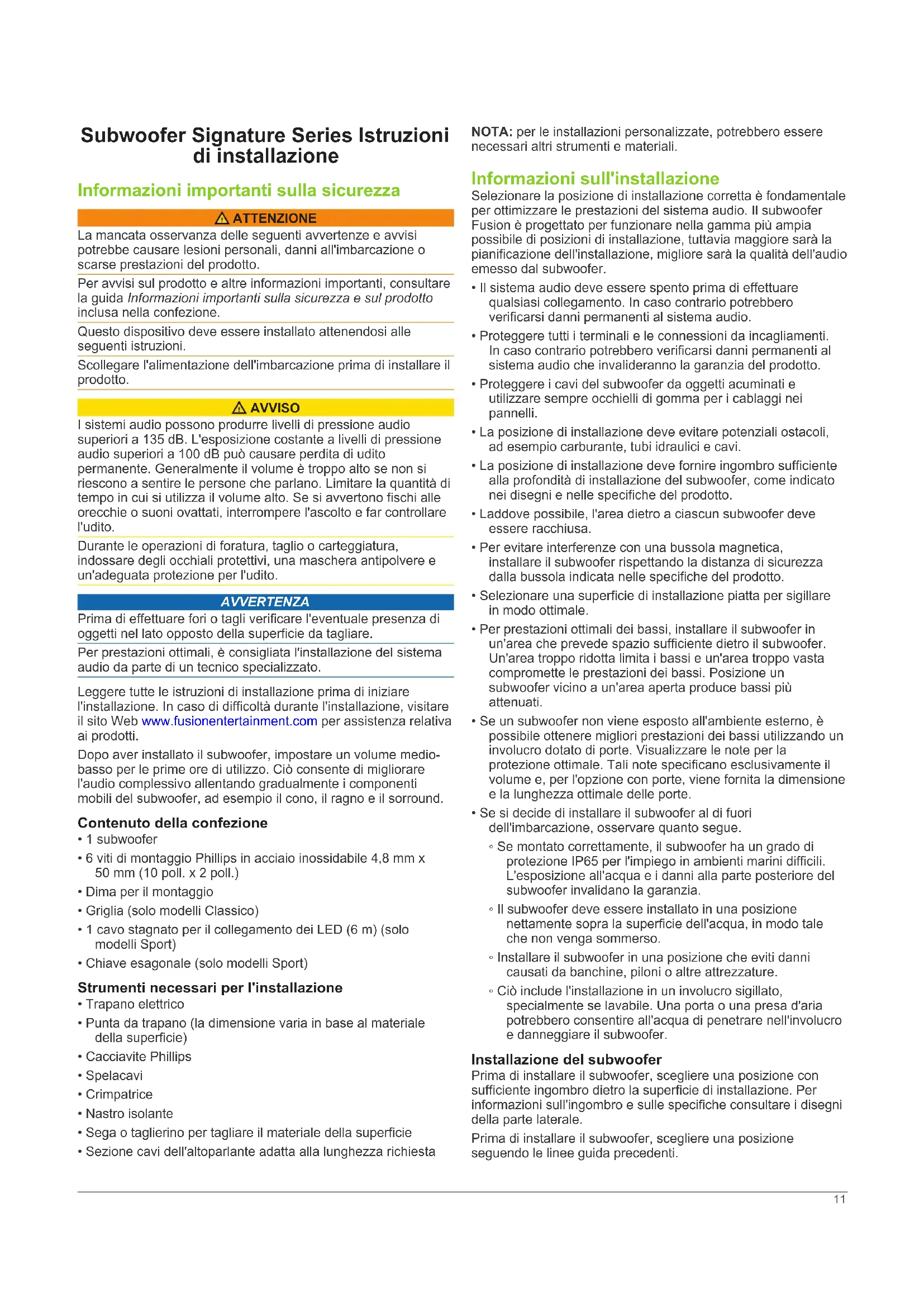 - Entièrement comblé avec du matériel d'absorption. ** Doublé avec le matériel d'absorption. 10Subwoofer Signature Series Istruzioni di installazione Informazioni importanti sulla sicurezza ATTENZIONE La mancata osservanza delle seguenti avvertenze e avvisi potrebbe causare lesioni personali, danni all'imbarcazione o scarse prestazioni del prodotto. Per avvisi sul prodotto e altre informazioni importanti, consultare la guida Informazioni importanti sulla sicurezza e sul prodotto inclusa nella confezione. Questo dispositivo deve essere installato attenendosi alle seguenti istruzioni. Scollegare l'alimentazione dell'imbarcazione prima di installare il prodotto. AVVISO I sistemi audio possono produrre livelli di pressione audio superiori a 135 dB. L'esposizione costante a livelli di pressione audio superiori a 100 dB può causare perdita di udito permanente. Generalmente il volume è troppo alto se non si riescono a sentire le persone che parlano. Limitare la quantità di tempo in cui si utilizza il volume alto. Se si avvertono fischi alle orecchie o suoni ovattati, interrompere l'ascolto e far controllare l'udito. Durante le operazioni di foratura, taglio o carteggiatura, indossare degli occhiali protettivi, una maschera antipolvere e un'adeguata protezione per l'udito. AVVERTENZA Prima di effettuare fori o tagli verificare l'eventuale presenza di oggetti nel lato opposto della superficie da tagliare. Per prestazioni ottimali, è consigliata l'installazione del sistema audio da parte di un tecnico specializzato. Leggere tutte le istruzioni di installazione prima di iniziare l'installazione. In caso di difficoltà durante l'installazione, visitare il sito Web www.fusionentertainment.com per assistenza relativa ai prodotti. Dopo aver installato il subwoofer, impostare un volume medio- basso per le prime ore di utilizzo. Ciò consente di migliorare l'audio complessivo allentando gradualmente i componenti mobili del subwoofer, ad esempio il cono, il ragno e il sorround. Contenuto della confezione