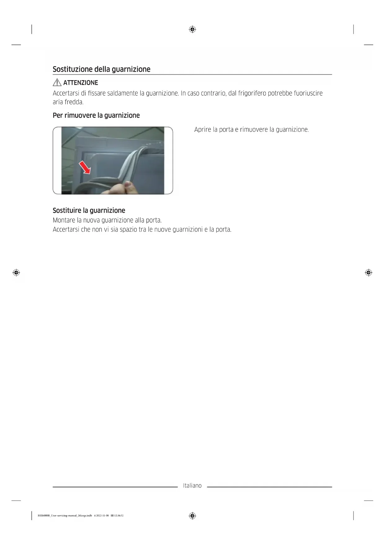 01 Pannello principale 02 Ripiano 03 Cassetto (Normale/Grande) 04 Etichetta con codice a barre BRR6000B_User-servicing-manual_26langs.indb 3 2022-11-08 12:36:52Italiano Sostituzione della guarnizione ATTENZIONE Accertarsi di ssare saldamente la guarnizione. In caso contrario, dal frigorifero potrebbe fuoriuscire aria fredda. Per rimuovere la guarnizione Aprire la porta e rimuovere la guarnizione. Sostituire la guarnizione Montare la nuova guarnizione alla porta. Accertarsi che non vi sia spazio tra le nuove guarnizioni e la porta. BRR6000B_User-servicing-manual_26langs.indb 4 2022-11-08 12:36:52Italiano Sostituire un cassetto ATTENZIONE Vericare che il cassetto sia correttamente inserito nella guida durante il montaggio. Per rimuovere il cassetto Sollevare delicatamente la parte anteriore del cassetto ed estrarlo. Per rimontare i cassetti Rimontare i cassetti seguendo l'ordine contrario seguito per la rimozione. Sostituzione delle cerniere Per sostituire le cerniere, rimuovere prima la porta. AVVERTENZA
