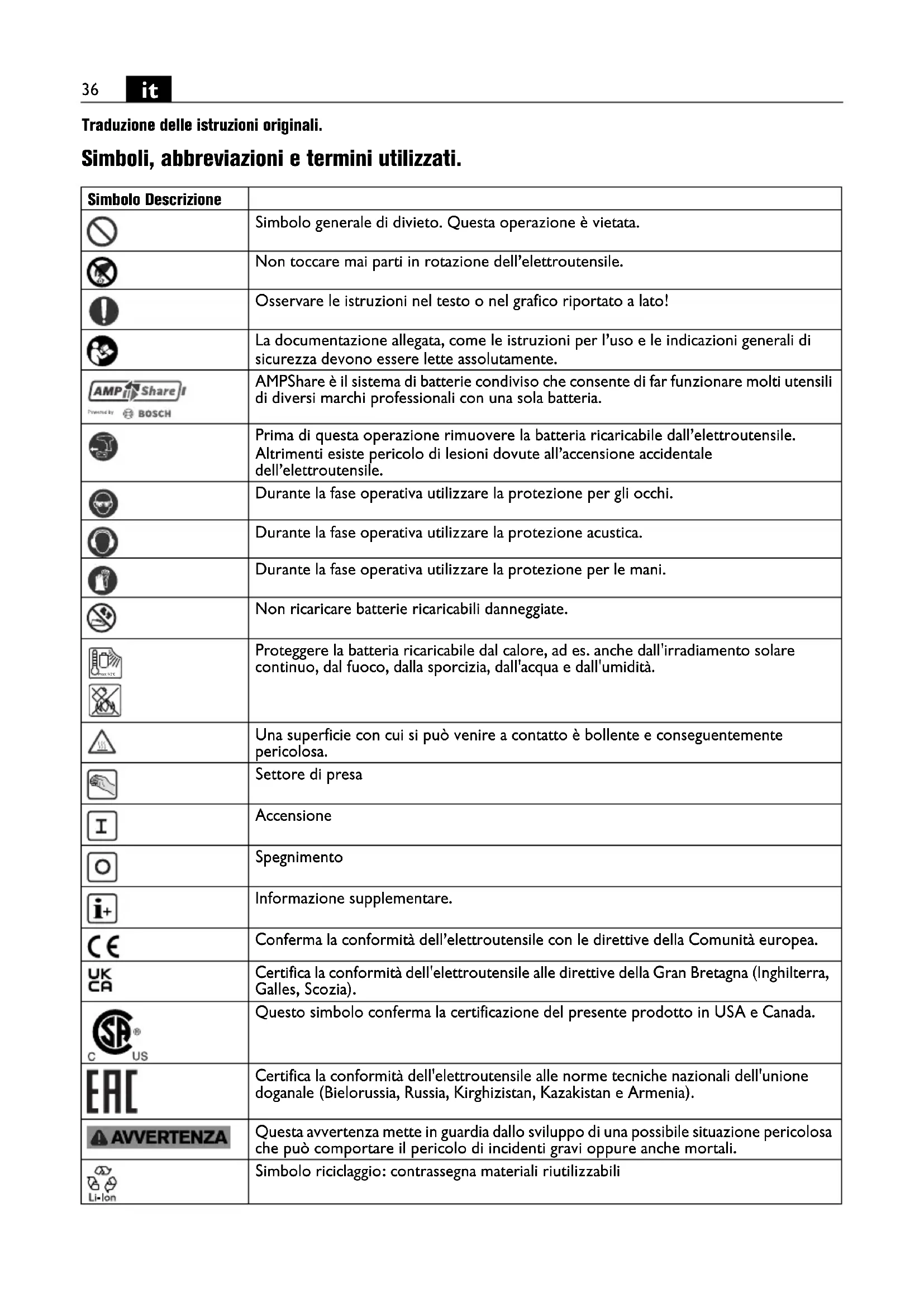 Traduzione delle istruzioni originali. Simboli, abbreviazioni e termini utilizzati. Simbolo Descrizione Simbolo generale di divieto. Questa operazione è vietata. Non toccare mai parti in rotazione dell’elettroutensile. Osservare le istruzioni nel testo o nel grafico riportato a lato! La documentazione allegata, come le istruzioni per l’uso e le indicazioni generali di sicurezza devono essere lette assolutamente. AMPShare è il sistema di batterie condiviso che consente di far funzionare molti utensili di diversi marchi professionali con una sola batteria. Prima di questa operazione rimuovere la batteria ricaricabile dall’elettroutensile. Altrimenti esiste pericolo di lesioni dovute all’accensione accidentale dell’elettroutensile. Durante la fase operativa utilizzare la protezione per gli occhi. Durante la fase operativa utilizzare la protezione acustica. Durante la fase operativa utilizzare la protezione per le mani. Non ricaricare batterie ricaricabili danneggiate. Proteggere la batteria ricaricabile dal calore, ad es. anche dall'irradiamento solare continuo, dal fuoco, dalla sporcizia, dall'acqua e dall'umidità. Una superficie con cui si può venire a contatto è bollente e conseguentemente pericolosa. Settore di presa Accensione Spegnimento Informazione supplementare. Conferma la conformità dell’elettroutensile con le direttive della Comunità europea. Certifica la conformità dell'elettroutensile alle direttive della Gran Bretagna (Inghilterra, Galles, Scozia). Questo simbolo conferma la certificazione del presente prodotto in USA e Canada. Certifica la conformità dell'elettroutensile alle norme tecniche nazionali dell'unione doganale (Bielorussia, Russia, Kirghizistan, Kazakistan e Armenia). Questa avvertenza mette in guardia dallo sviluppo di una possibile situazione pericolosa che può comportare il pericolo di incidenti gravi oppure anche mortali. Simbolo riciclaggio: contrassegna materiali riutilizzabili max.50°C37