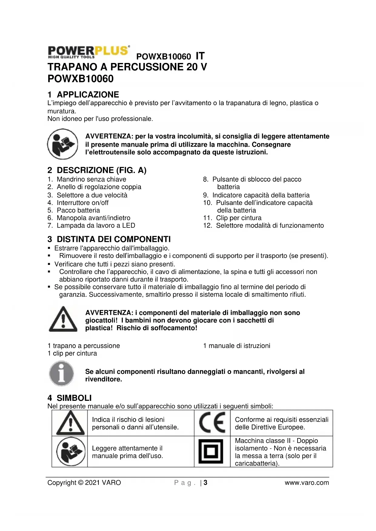 Macchina classe II - Doppio isolamento - Non è necessaria la messa a terra (solo per il caricabatteria).POWXB10060 IT Copyright © 2021 VARO P a g . | 4 www.varo.com
