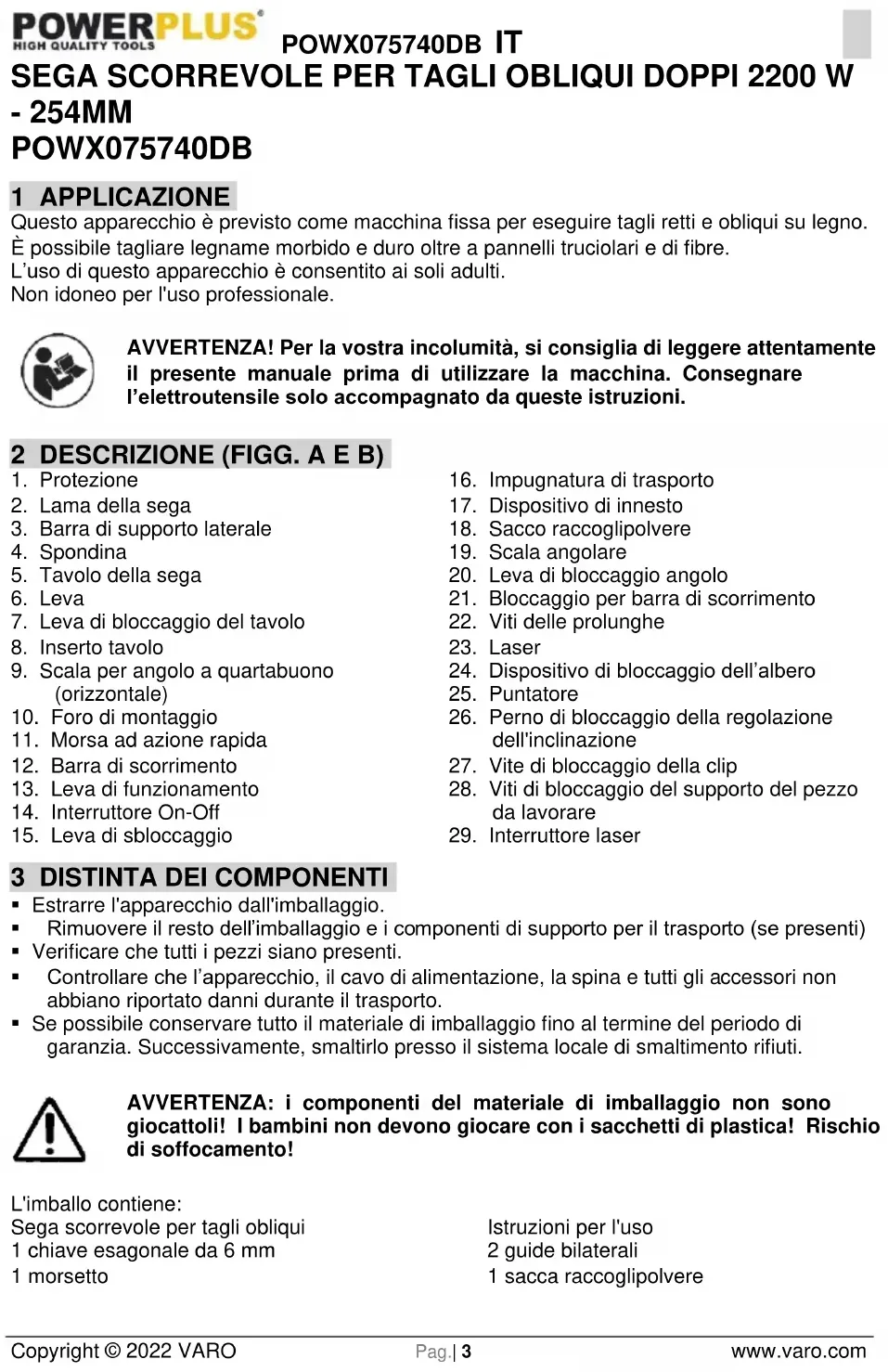 Copyright © 2022 VARO Pag.| 3 www.varo.com SEGA SCORREVOLE PER TAGLI OBLIQUI DOPPI 2200 W - 254MM POWX075740DB 1 APPLICAZIONE Questo apparecchio è previsto come macchina fissa per eseguire tagli retti e obliqui su legno. È possibile tagliare legname morbido e duro oltre a pannelli truciolari e di fibre. L’uso di questo apparecchio è consentito ai soli adulti. Non idoneo per l'uso professionale. AVVERTENZA! Per la vostra incolumità, si consiglia di leggere attentamente il presente manuale prima di utilizzare la macchina. Consegnare l’elettroutensile solo accompagnato da queste istruzioni. 2 DESCRIZIONE (FIGG. A E B)