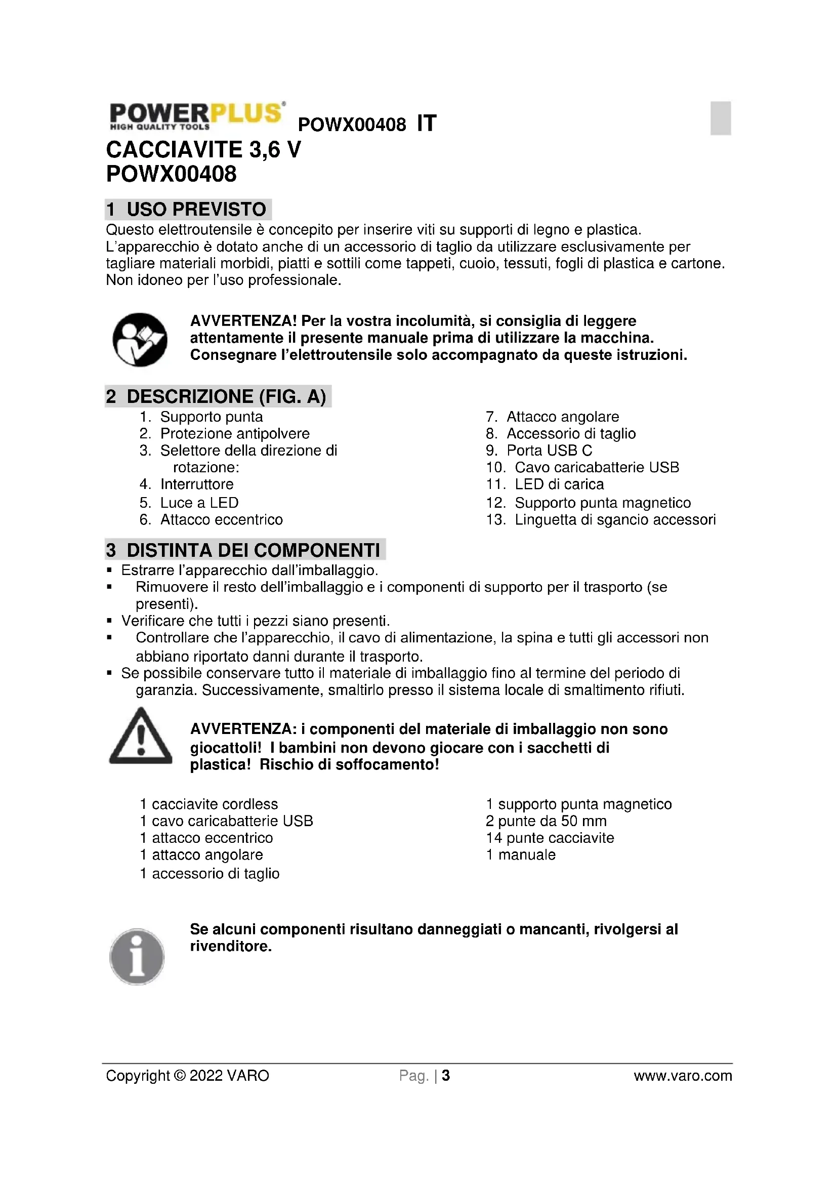 Copyright © 2022 VARO Pag. | 3 www.varo.com CACCIAVITE 3,6 V POWX00408 1 USO PREVISTO Questo elettroutensile è concepito per inserire viti su supporti di legno e plastica. L’apparecchio è dotato anche di un accessorio di taglio da utilizzare esclusivamente per tagliare materiali morbidi, piatti e sottili come tappeti, cuoio, tessuti, fogli di plastica e cartone. Non idoneo per l’uso professionale. AVVERTENZA! Per la vostra incolumità, si consiglia di leggere attentamente il presente manuale prima di utilizzare la macchina. Consegnare l’elettroutensile solo accompagnato da queste istruzioni. 2 DESCRIZIONE (FIG. A)
