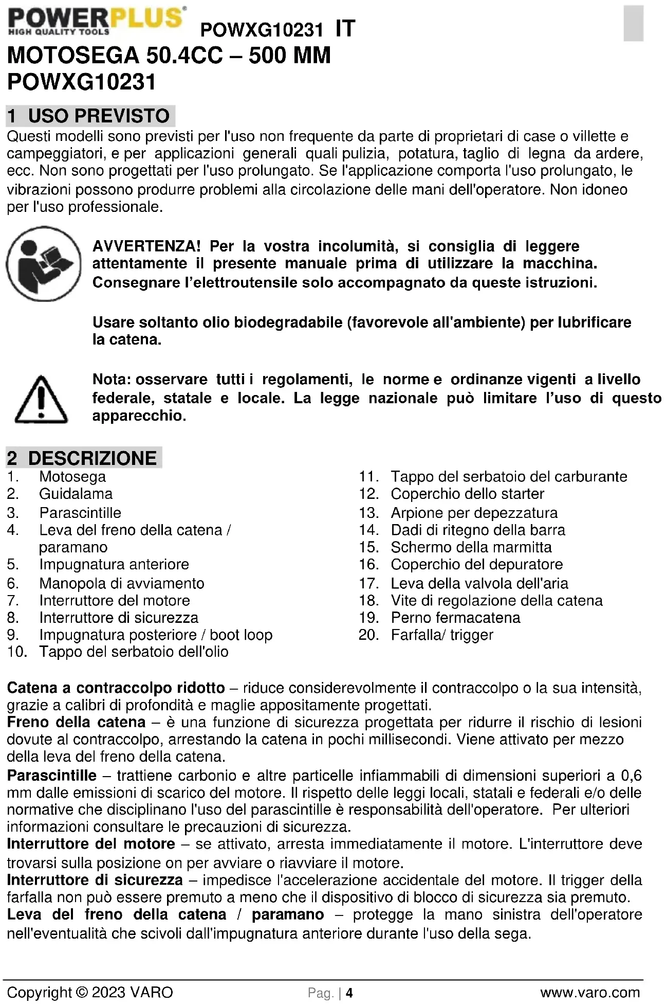 Catena a contraccolpo ridotto – riduce considerevolmente il contraccolpo o la sua intensità, grazie a calibri di profondità e maglie appositamente progettati. Freno della catena – è una funzione di sicurezza progettata per ridurre il rischio di lesioni dovute al contraccolpo, arrestando la catena in pochi millisecondi. Viene attivato per mezzo della leva del freno della catena. Parascintille – trattiene carbonio e altre particelle infiammabili di dimensioni superiori a 0,6 mm dalle emissioni di scarico del motore. Il rispetto delle leggi locali, statali e federali e/o delle normative che disciplinano l'uso del parascintille è responsabilità dell'operatore. Per ulteriori informazioni consultare le precauzioni di sicurezza. Interruttore del motore – se attivato, arresta immediatamente il motore. L'interruttore deve trovarsi sulla posizione on per avviare o riavviare il motore. Interruttore di sicurezza – impedisce l'accelerazione accidentale del motore. Il trigger della farfalla non può essere premuto a meno che il dispositivo di blocco di sicurezza sia premuto. Leva del freno della catena / paramano – protegge la mano sinistra dell'operatore nell'eventualità che scivoli dall'impugnatura anteriore durante l'uso della sega.POWXG10231 IT Copyright © 2023 VARO Pag. | 5 www.varo.com Fermo della catena – riduce il rischio di lesioni nell'eventualità che la catena si rompa o fuoriesca dalla guida durante l'uso. Il fermo della catena è progettato per intercettare la catena saltata. Nota: studiare la sega e acquisire dimestichezza con i componenti ATTENZIONE! Rischio di contraccolpo. Afferrare saldamente la motosega con entrambe le mani durante l'uso. Per la sicurezza dell'operatore, è opportuno leggere e seguire le precauzioni di sicurezza descritte in questo manuale prima di mettere in funzione la motosega. L'uso improprio può provocare gravi lesioni. ATTENZIONE! Durante l'uso di utensili a gas, è necessario attuare semplici precauzioni, incluse quelle descritte di seguito, al fine di ridurre il rischio di gravi lesioni personali e/o danni all'apparecchio.