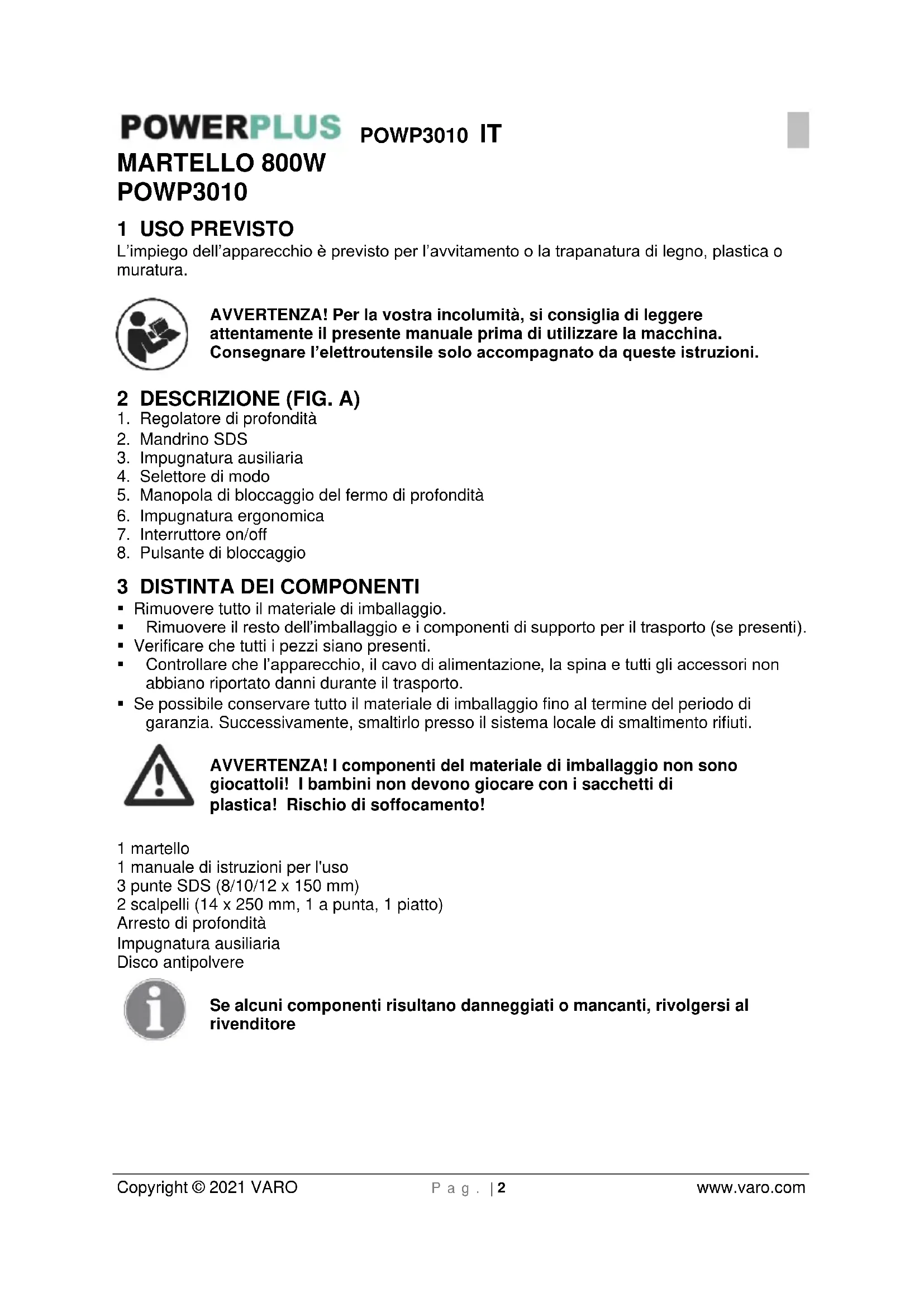 Copyright © 2021 VARO P a g . | 2 www.varo.com MARTELLO 800W POWP3010 1 USO PREVISTO L’impiego dell’apparecchio è previsto per l’avvitamento o la trapanatura di legno, plastica o muratura. AVVERTENZA! Per la vostra incolumità, si consiglia di leggere attentamente il presente manuale prima di utilizzare la macchina. Consegnare l’elettroutensile solo accompagnato da queste istruzioni. 2 DESCRIZIONE (FIG. A)