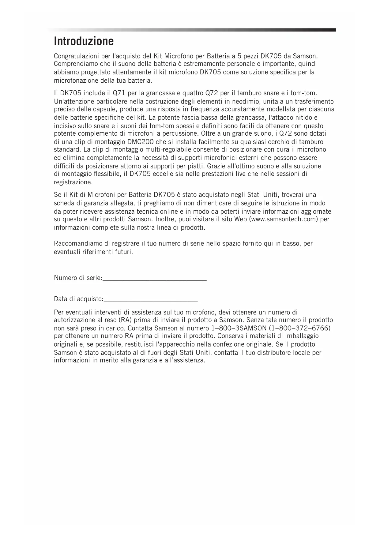 Juego de micrófonos de 5 piezas DK705 para batería Q71: micrófono de bombo de pedal Tipo Micrófono dinámico Patrón polar Supercadioide Respuesta de frecuencia 50~16000 Hz Sensibilidad -62 dBV/pa (0,8 mv/pa) Impedancia nominal 200Ω SPL máx. 147 dB (THD ≤ 0,5 % 1000 Hz) Peso 370 g Q72: Micrófono de bombo de pedal/tamtam Tipo Micrófono dinámico Patrón polar Supercadioide Respuesta de frecuencia 50~16000 Hz Sensibilidad -55 dBV/pa (0,78 mv/pa) Impedancia nominal 200Ω SPL máx. 133 dB (THD ≤ 0,5 % 1000 Hz) Peso 150 g (con DMC 100) Especificaciones Q71: Micrófono de bombo de pedal Q72: Micrófono de bombo de pedal/tamtam Gráficos de frecuencia y trazados polaresIntroduzione Congratulazioni per l'acquisto del Kit Microfono per Batteria a 5 pezzi DK705 da Samson. Comprendiamo che il suono della batteria è estremamente personale e importante, quindi abbiamo progettato attentamente il kit microfono DK705 come soluzione specifica per la microfonazione della tua batteria. Il DK705 include il Q71 per la grancassa e quattro Q72 per il tamburo snare e i tom-tom. Un'attenzione particolare nella costruzione degli elementi in neodimio, unita a un trasferimento preciso delle capsule, produce una risposta in frequenza accuratamente modellata per ciascuna delle batterie specifiche del kit. La potente fascia bassa della grancassa, l'attacco nitido e incisivo sullo snare e i suoni dei tom-tom spessi e definiti sono facili da ottenere con questo potente complemento di microfoni a percussione. Oltre a un grande suono, i Q72 sono dotati di una clip di montaggio DMC200 che si installa facilmente su qualsiasi cerchio di tamburo standard. La clip di montaggio multi-regolabile consente di posizionare con cura il microfono ed elimina completamente la necessità di supporti microfonici esterni che possono essere difficili da posizionare attorno ai supporti per piatti. Grazie all'ottimo suono e alla soluzione di montaggio flessibile, il DK705 eccelle sia nelle prestazioni live che nelle sessioni di registrazione. Se il Kit di Microfoni per Batteria DK705 è stato acquistato negli Stati Uniti, troverai una scheda di garanzia allegata, ti preghiamo di non dimenticare di seguire le istruzione in modo da poter ricevere assistenza tecnica online e in modo da poterti inviare informazioni aggiornate su questo e altri prodotti Samson. Inoltre, puoi visitare il sito Web (www.samsontech.com) per informazioni complete sulla nostra linea di prodotti. Raccomandiamo di registrare il tuo numero di serie nello spazio fornito qui in basso, per eventuali riferimenti futuri. Numero di serie:_______________________________ Data di acquisto:____________________________ Per eventuali interventi di assistenza sul tuo microfono, devi ottenere un numero di autorizzazione al reso (RA) prima di inviare il prodotto a Samson. Senza tale numero il prodotto non sarà preso in carico. Contatta Samson al numero 1−800−3SAMSON (1−800−372−6766) per ottenere un numero RA prima di inviare il prodotto. Conserva i materiali di imballaggio originali e, se possibile, restituisci l'apparecchio nella confezione originale. Se il prodotto Samson è stato acquistato al di fuori degli Stati Uniti, contatta il tuo distributore locale per informazioni in merito alla garanzia e all’assistenza.ENGLISH