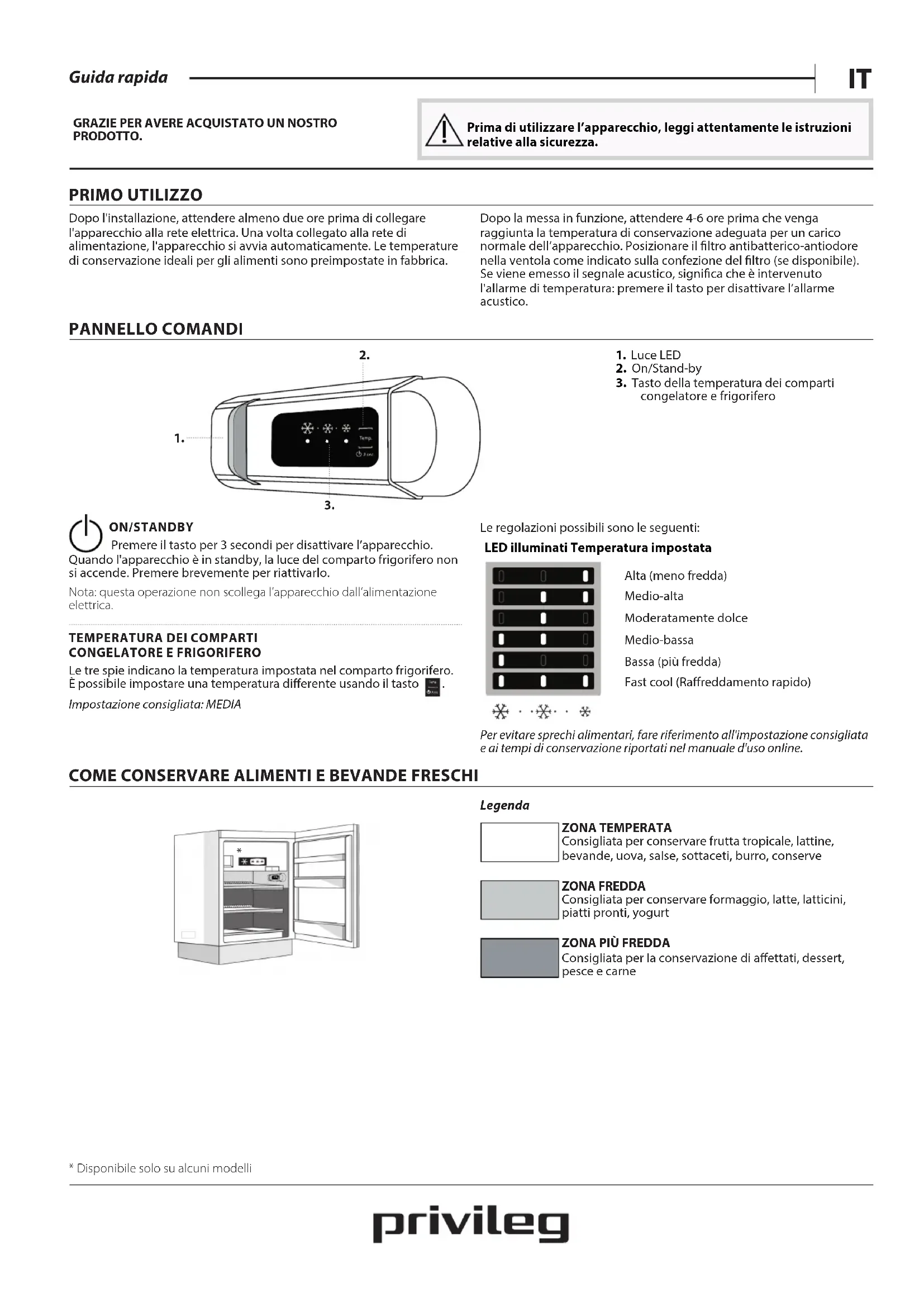 Legenda ZONA TEMPERATA Consigliata per conservare frutta tropicale, lattine, bevande, uova, salse, sottaceti, burro, conserve ZONA FREDDA Consigliata per conservare formaggio, latte, latticini, piatti pronti, yogurt