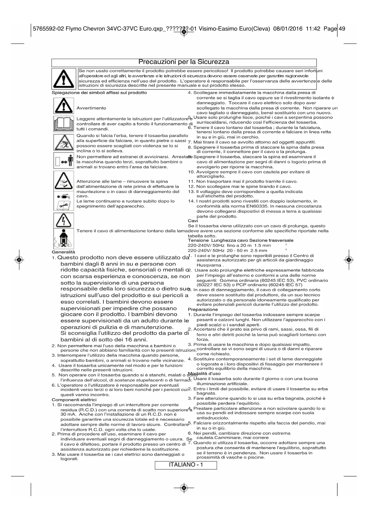 conformità alla norma EN60335. In nessuna circostanza devono collegarsi dispositivi di messa a terra a qualsiasi parte del prodotto. Cavi Se il tosaerba viene utilizzato con un cavo di prolunga, questo deve avere una sezione conforme alle specifiche riportate nella tabella sotto. Tensione Lunghezza cavo Sezione trasversale 220-240V/ 50Hz fino a 20 m 1.5 mm