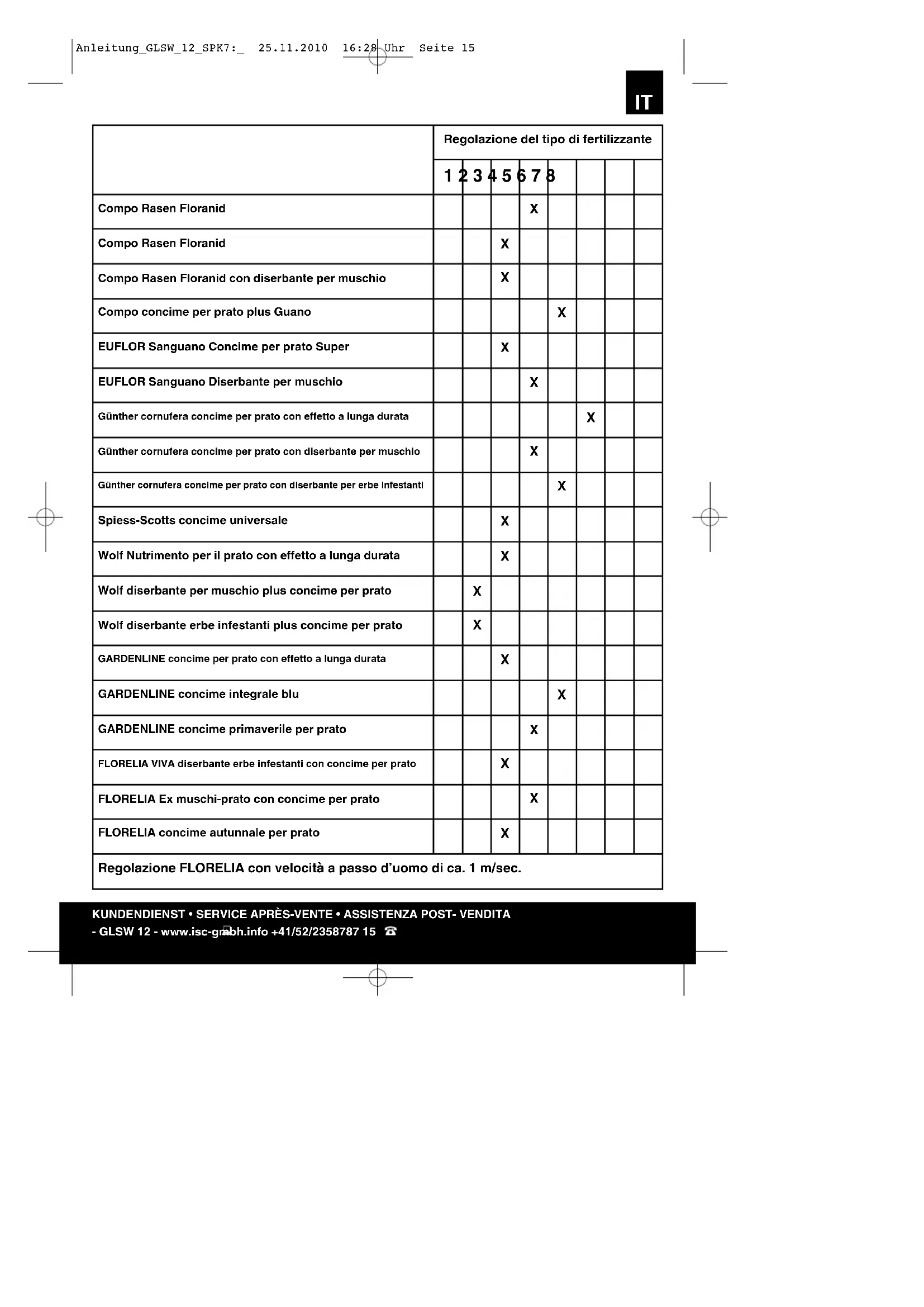 KUNDENDIENST • SERVICE APRÈS-VENTE • ASSISTENZA POST- VENDITA - GLSW 12 - www.isc-gmbh.info +41/52/2358787 18 Anleitung_GLSW_12_SPK7:_ 25.11.2010 16:28 Uhr Seite 18l’applicazione sovrapponendo le corsie e facendo attenzione che non restino punti non cosparsi. Trattare poi (ad esempio annaffiare) la superficie cosparsa seguendo le avvertenze indicate sulla confezione del concime/semente.