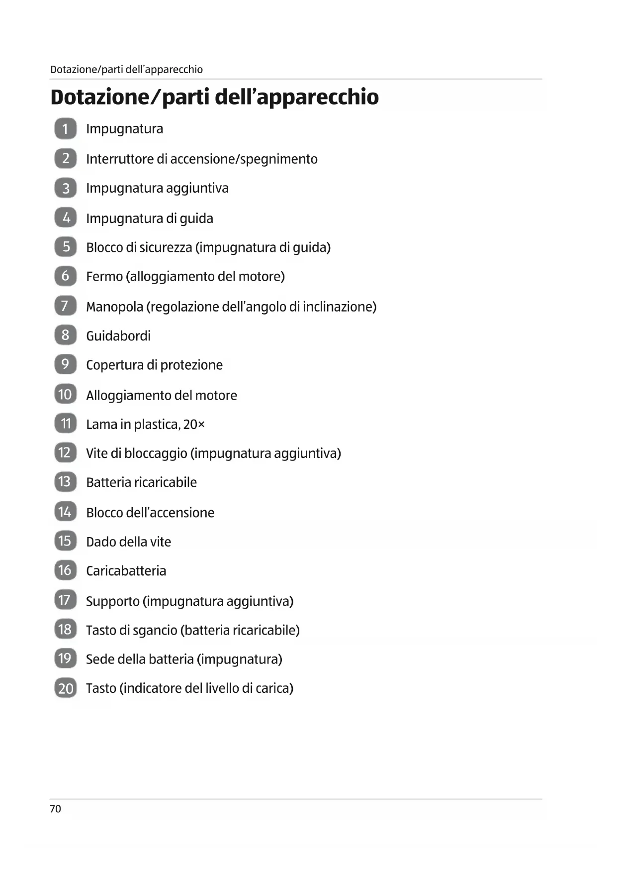 − Non servirsi mai del cavo di alimentazione per reggere l’apparecchio. − Proteggere il tagliabordi dall’umidità e dalla pioggia. − Tenere il tagliabordi, la batteria ricaricabile e il caricabatteria lontani da fiamme libere e superfici roventi. − Non usare il tagliabordi se presenta danni visibili e se la batte- ria ricaricabile è difettosa. − Tenere la superficie da tagliare priva di cavi e oggetti duri. − Familiarizzare con gli elementi di comando e regolazione e con l’uso corretto del tagliabordi. − Non aprire l’involucro, bensì far eseguire la riparazione da persone qualificate. Rivolgersi ad un’officina specializzata. In caso di riparazioni eseguite in proprio, allacciamento non corretto o errato utilizzo, si escludono responsabilità e diritti di garanzia. − Non utilizzare il tagliabordi in caso di pioggia o in ambienti umidi o bagnati. − Non utilizzare il tagliabordi con un timer esterno o un sistema di controllo a distanza separato. − Non immergere in acqua né in altri liquidi il tagliabordi, la batteria ricaricabile o il caricabatteria. − Non toccare mai con le mani il tagliabordi se è caduto in acqua. − Accertarsi che bambini non inseriscano oggetti nel tagliabordi. − Se il tagliabordi non viene utilizzato, oppure se lo si pulisce o se si verifica un malfunzionamento, spegnerlo sempre e rimuovere la batteria ricaricabile. AVVERTIMENTO! Pericolo di ferimento! Le batterie ricaricabili possono contenere materiali infiammabili. Se le batterie ricaricabili vengono utilizzate in modo non corretto, possono avere perdite, surriscaldarsi, incendiarsi o esplodere in determinate condizioni. Ciò può causare gravi lesioni. − Non surriscaldare le batterie ricaricabili e non gettarle in fiamme libere.Sicurezza