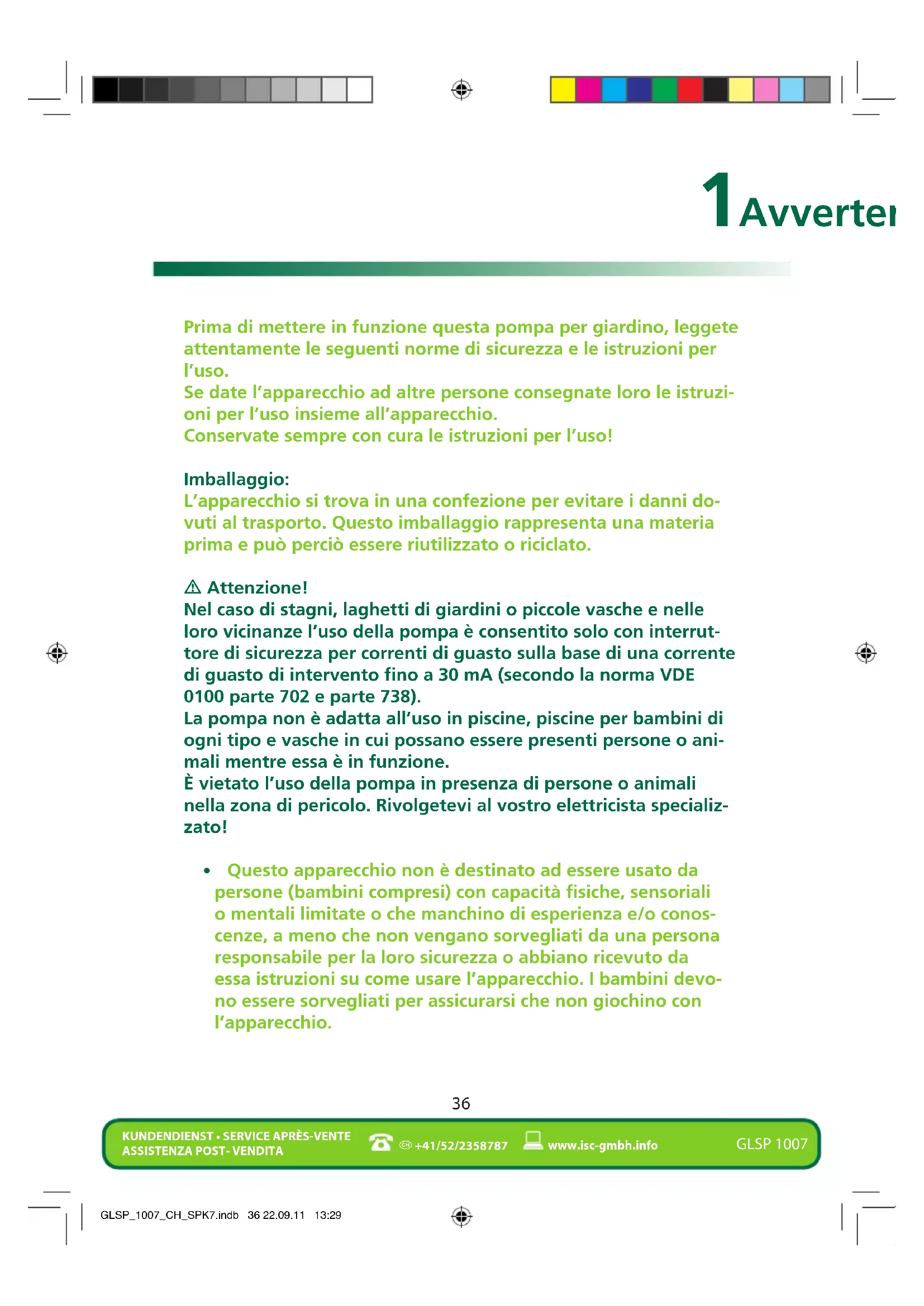 +41/52/2358787 www.isc-gmbh.info GLSP 1007 Indice 36 Avvertenze di sicurezza 38 Elementi forniti 39 Descrizione dell’apparecchio 40 Uso 41 Prima della messa in esercizio 44 Funzionamento 45 Informazioni 50 Garanzia GLSP_1007_CH_SPK7.indb 35 22.09.11 13:2936