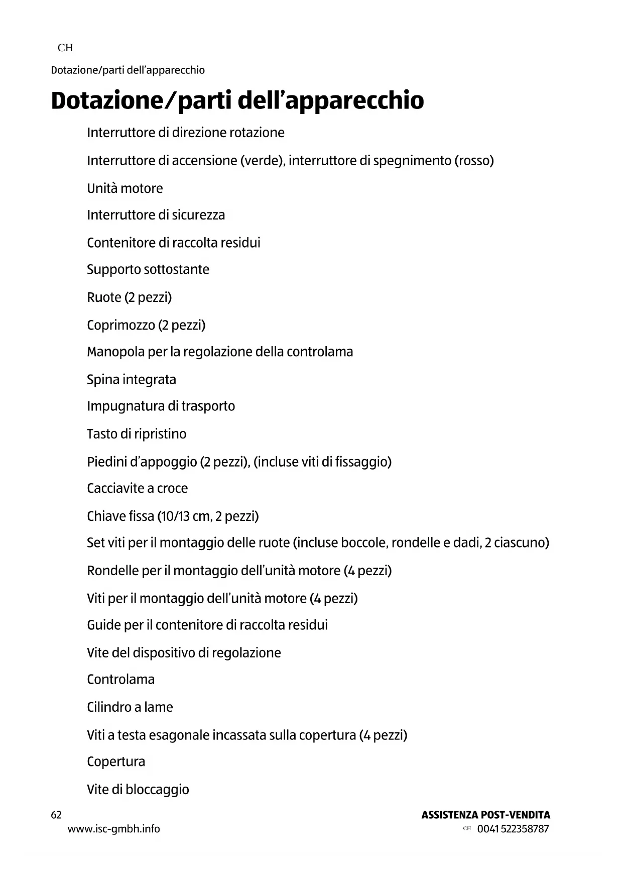 www.isc-gmbh.info 0041 522358787ASSISTENZA POST-VENDITA Prima messa in servizio Controllare la cippatrice da giardino e la dotazione ATTENZIONE! Pericolo di ferimento! La cippatrice da giardino è pesante. Se la si solleva dalla confezione da soli, è possibile ferirsi. − Si consiglia di sollevare la cippatrice da giardino in due dalla confezione.