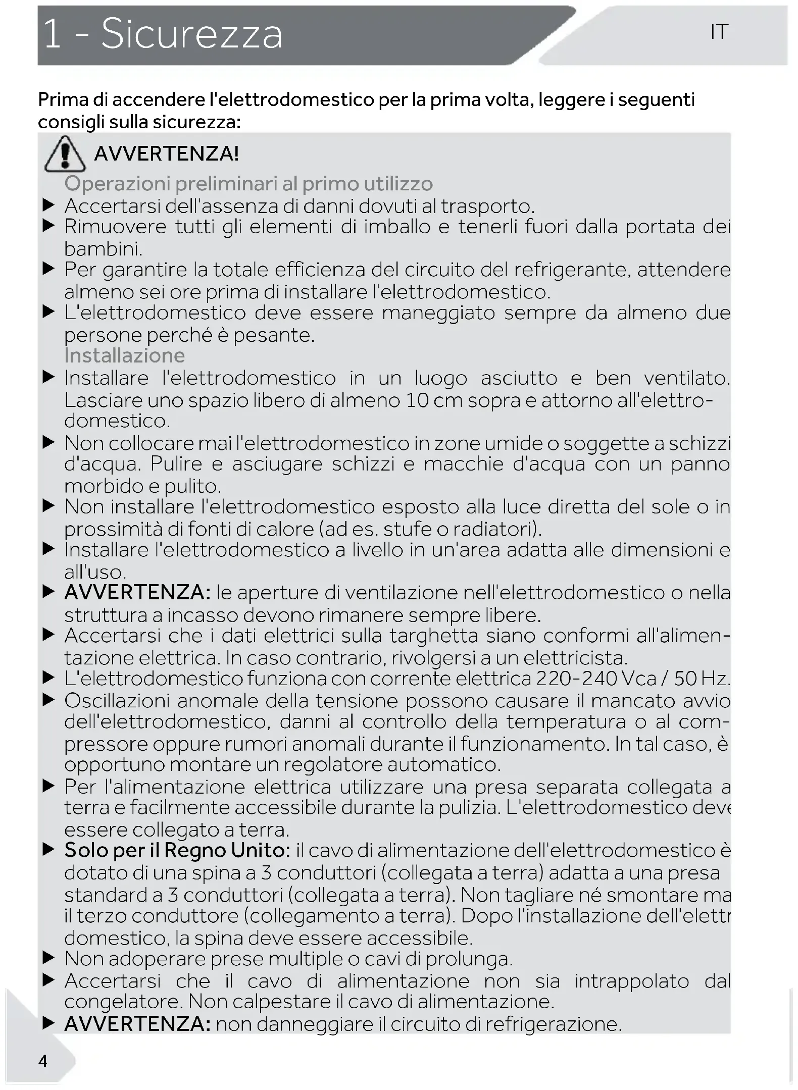 AVVERTENZA! Operazioni preliminari al primo utilizzo Accertarsi dell'assenza di danni dovuti al trasporto. Rimuovere tutti gli elementi di imballo e tenerli fuori dalla portata dei bambini. Per garantire la totale efficienza del circuito del refrigerante, attendere almeno sei ore prima di installare l'elettrodomestico. L'elettrodomestico deve essere maneggiato sempre da almeno due persone perché è pesante. Installazione Installare l'elettrodomestico in un luogo asciutto e ben ventilato. Lasciare uno spazio libero di almeno 10 cm sopra e attorno all'elettro- domestico. Non collocare mai l'elettrodomestico in zone umide o soggette a schizzi d'acqua. Pulire e asciugare schizzi e macchie d'acqua con un panno morbido e pulito. Non installare l'elettrodomestico esposto alla luce diretta del sole o in prossimità di fonti di calore (ad es. stufe o radiatori). Installare l'elettrodomestico a livello in un'area adatta alle dimensioni e all'uso. AVVERTENZA: le aperture di ventilazione nell'elettrodomestico o nella struttura a incasso devono rimanere sempre libere. Accertarsi che i dati elettrici sulla targhetta siano conformi all'alimen- tazione elettrica. In caso contrario, rivolgersi a un elettricista. L'elettrodomestico funziona con corrente elettrica 220-240 Vca / 50 Hz. Oscillazioni anomale della tensione possono causare il mancato avvio dell'elettrodomestico, danni al controllo della temperatura o al com- pressore oppure rumori anomali durante il funzionamento. In tal caso, è opportuno montare un regolatore automatico. Per l'alimentazione elettrica utilizzare una presa separata collegata a terra e facilmente accessibile durante la pulizia. L'elettrodomestico deve essere collegato a terra. Solo per il Regno Unito: il cavo di alimentazione dell'elettrodomestico è dotato di una spina a 3 conduttori (collegata a terra) adatta a una presa standard a 3 conduttori (collegata a terra). Non tagliare né smontare mai il terzo conduttore (collegamento a terra). Dopo l'installazione dell'elettro- domestico, la spina deve essere accessibile. Non adoperare prese multiple o cavi di prolunga. Accertarsi che il cavo di alimentazione non sia intrappolato dal congelatore. Non calpestare il cavo di alimentazione. AVVERTENZA: non danneggiare il circuito di refrigerazione.IT