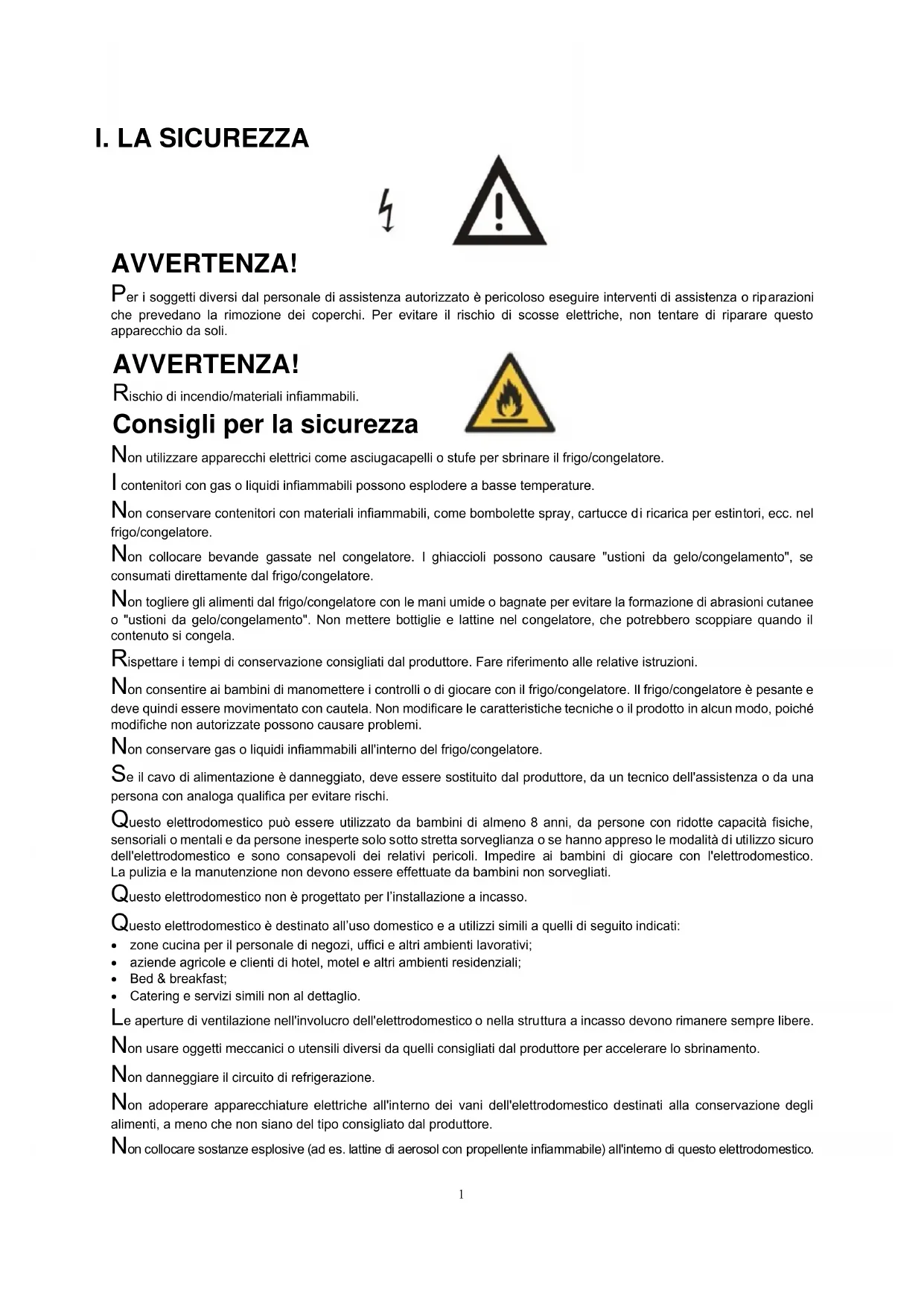 AVVERTENZA! Per i soggetti diversi dal personale di assistenza autorizzato è pericoloso eseguire interventi di assistenza o riparazioni che prevedano la rimozione dei coperchi. Per evitare il rischio di scosse elettriche, non tentare di riparare questo apparecchio da soli. AVVERTENZA! Rischio di incendio/materiali infiammabili. Consigli per la sicurezza Non utilizzare apparecchi elettrici come asciugacapelli o stufe per sbrinare il frigo/congelatore. I contenitori con gas o liquidi infiammabili possono esplodere a basse temperature. Non conservare contenitori con materiali infiammabili, come bombolette spray, cartucce di ricarica per estintori, ecc. nel frigo/congelatore. Non collocare bevande gassate nel congelatore. I ghiaccioli possono causare "ustioni da gelo/congelamento", se consumati direttamente dal frigo/congelatore. Non togliere gli alimenti dal frigo/congelatore con le mani umide o bagnate per evitare la formazione di abrasioni cutanee o "ustioni da gelo/congelamento". Non mettere bottiglie e lattine nel congelatore, che potrebbero scoppiare quando il contenuto si congela. Rispettare i tempi di conservazione consigliati dal produttore. Fare riferimento alle relative istruzioni. Non consentire ai bambini di manomettere i controlli o di giocare con il frigo/congelatore. Il frigo/congelatore è pesante e deve quindi essere movimentato con cautela. Non modificare le caratteristiche tecniche o il prodotto in alcun modo, poiché modifiche non autorizzate possono causare problemi. Non conservare gas o liquidi infiammabili all'interno del frigo/congelatore. Se il cavo di alimentazione è danneggiato, deve essere sostituito dal produttore, da un tecnico dell'assistenza o da una persona con analoga qualifica per evitare rischi. Questo elettrodomestico può essere utilizzato da bambini di almeno 8 anni, da persone con ridotte capacità fisiche, sensoriali o mentali e da persone inesperte solo sotto stretta sorveglianza o se hanno appreso le modalità di utilizzo sicuro dell'elettrodomestico e sono consapevoli dei relativi pericoli. Impedire ai bambini di giocare con l'elettrodomestico. La pulizia e la manutenzione non devono essere effettuate da bambini non sorvegliati. Questo elettrodomestico non è progettato per l’installazione a incasso. Questo elettrodomestico è destinato all’uso domestico e a utilizzi simili a quelli di seguito indicati: