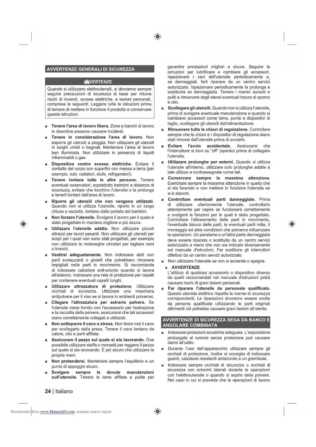 AVVERTENZE Quando si utilizzano elettroutensili, si dovranno sempre seguire precauzioni di sicurezza di base per ridurre rischi di incendi, scosse elettriche, e lesioni personali, comprese le seguenti. Leggere tutte le istruzioni prima di tentare di mettere in funzione il prodotto e conservare queste istruzioni. Ŷ Tenere l'area di lavoro libera. Zone e banchi di lavoro in disordine possono causare incidenti. Ŷ Tenere in considerazione l'area di lavoro. Non esporre gli utensili a pioggia. Non utilizzare gli utensili in luoghi umidi o bagnati. Mantenere l’area di lavoro ben illuminata. Non utilizzare in presenza di liquidi infiammabili o gas. Ŷ Dispositivo contro scosse elettriche. Evitare il contatto del corpo con superfici con messa a terra (per esempio, tubi, radiatori, stufe, refrigeratori). Ŷ Tenere lontane tutte le altre persone. Tenere eventuali osservatori, soprattutto bambini a distanza di sicurezza, evitare che tocchino l'utensile o la prolunga e tenerli lontani dall'area di lavoro. Ŷ Riporre gli utensili che non vengono utilizzati. Quando non si utilizza l'utensile, riporlo in un luogo chiuso e asciutto, lontano dalla portata dei bambini. Ŷ Non forzare l'utensile. Svolgerà il lavoro per il quale è stato progettato in maniera migliore e più sicura. Ŷ Utilizzare l'utensile adatto. Non utilizzare piccoli attrezzi per lavori pesanti. Non utilizzare gli utensili per scopi per i quali non sono stati progettati, per esempio non utilizzare le motoseghe circolari per tagliare rami o tronchi. Ŷ Vestirsi adeguatamente. Non indossare abiti con parti svolazzanti o gioielli che potrebbero rimanere impigliati nelle parti in movimento. Si raccomanda di indossare calzature anti-scivolo quando si lavora all'esterno. Indossare una rete di protezione per capelli per contenere eventuali capelli lunghi. Ŷ Utilizzare attrezzatura di protezione. Utilizzare occhiali di sicurezza. Utilizzare una maschera antipolvere per il viso se si lavora in ambienti polverosi. Ŷ Cllegare l'attrezzatura per estrarre polvere. Se l'utensile viene fornito con l'accessorio per l'estrazione e la raccolta della polvere, assicurarsi che tali accessori siano correttamente collegati e utilizzati. Ŷ Non sottoporre il cavo a stress. Non tirare mai il cavo per scollegarlo dalla presa. Tenere il cavo lontano da calore, olio e parti affilate. Ŷ Assicurare il pezzo sul quale si sta lavorando. Ove possibile utilizzare staffe o morsetti per reggere il pezzo sul quale si sta lavorando. È più sicuro che utilizzare le proprie mani. Ŷ Non protendersi. Mantenere sempre l’equilibrio e un punto di appoggio sicuro. Ŷ Svolgere sempre le dovute manutenzioni sull’utensile. Tenere le lame affilate e pulite per garantire prestazioni migliori e sicure. Seguire le istruzioni per lubrificare e cambiare gli accessori. Ispezionare i cavi dell'utensile periodicamente e, se danneggiati, farli riparare da un centro servizi autorizzato. Ispezionare periodicamente la prolunga e sostituirla se danneggiata. Tenere i manici asciutti e puliti e rimuovere dagli stessi eventuali tracce di sporco e olio. Ŷ Scollegare gli utensili. Quando non si utilizza l'utensile, prima di svolgere eventuale manutenzione e quando si cambiano accessori come lame, punte e dispositivi di taglio, scollegare gli utensili dall'alimentazione. Ŷ Rimuovere tutte le chiavi di regolazione. Controllare sempre che le chiavi e i dispositivi di regolazione siano stati rimossi dall'utensile prima di avviarlo. Ŷ Evitare l'avvio accidentale. Assicurarsi che l'interruttore si trovi su “off” (spento) prima di collegare l'utensile. Ŷ Utilizzare prolunghe per esterni. Quando si utilizza l'utensile all'interno, utilizzare solo prolunghe adatte a tale utilizzo e contrassegnate come tali. Ŷ Conservare sempre la massima attenzione. Esercitare sempre la massima attenzione in quello che si sta facendo e non mettere in funzione l'utensile se si è stanchi. Ŷ Controllare eventuali parti danneggiate. Prima di utilizzare ulteriormente l'utensile, controllarlo attentamente per capire se funzionerà correttamente e svolgerà le funzioni per le quali è stato progettato. Controllare l'allineamento delle parti in movimento, l'eventuale blocco delle parti, le eventuali parti rotte, il montaggio ed altre condizioni che potranno influenzare le operazioni. Un paralame o un'altra parte danneggiata deve essere riparata o sostituita da un centro servizi autorizzato a meno che non sia indicato diversamente sul manuale d'istruzioni. Far sostituire gli interruttori difettosi da un centro servizi autorizzato. Ŷ Non utilizzare l'utensile se non si accende o spegne. Ŷ AVVERTENZE L'utilizzo di qualsiasi accessorio o dispositivo diverso da quelli raccomandati nel manuale d'istruzioni potrà causare rischi di gravi lesioni personali. Ŷ Far riparare l'utensile da personale qualificato. Questo utensile elettrico rispetta le norme di sicurezza corrispondenti. Le riparazioni dovranno essere svolte da persone qualificate utilizzando le parti originali altrimenti ciò potrebbe causare gravi lesioni all'utente. AVVERTENZE DI SICUREZZA SEGA DA BANCO E ANGOLARE COMBINATA Ŷ Indossare protezioni acustiche adeguate. L’esposizione prolungata al rumore senza protezione può causare danni all’udito. Ŷ Durante l’uso dell’apparecchio utilizzare sempre gli occhiali di protezione. Inoltre si consiglia di indossare guanti, calzature resistenti antiscivolo e un grembiule. Ŷ Indossare sempre occhiali di sicurezza o occhiali di sicurezza con schermi laterali durante le operazioni con l’elettroutensile o quando si aspira della polvere. Nel caso in cui si preveda che le operazioni di lavoro Downloaded from www.Manualslib.com manuals search engineEN