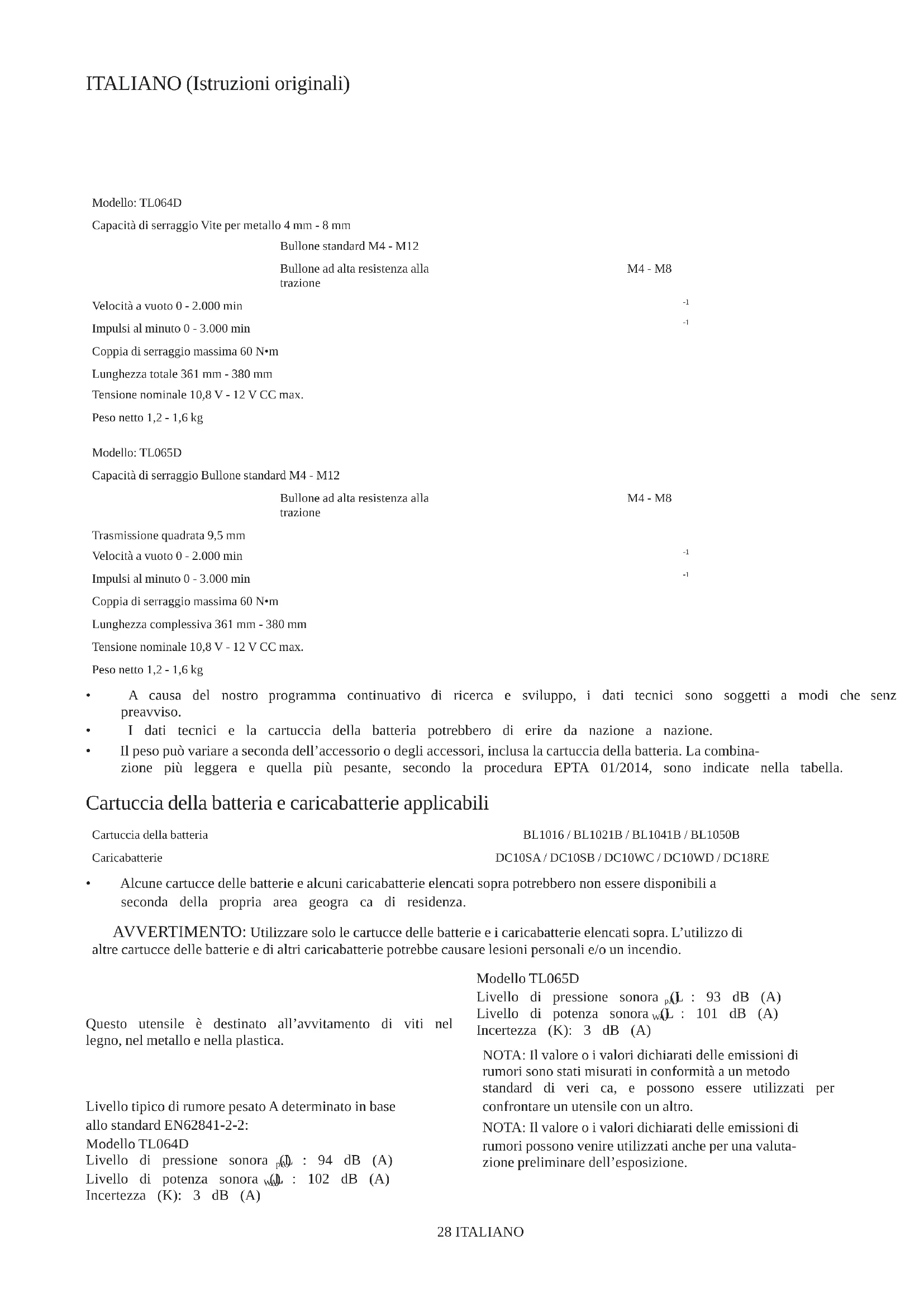 - Alcune cartucce delle batterie e alcuni caricabatterie elencati sopra potrebbero non essere disponibili a secondadellapropriaareageogracadiresidenza. AVVERTIMENTO: Utilizzare solo le cartucce delle batterie e i caricabatterie elencati sopra. L’utilizzo di altre cartucce delle batterie e di altri caricabatterie potrebbe causare lesioni personali e/o un incendio. Utilizzo previsto Questoutensileèdestinatoall’avvitamentodivitinel legno, nel metallo e nella plastica. Rumore Livello tipico di rumore pesato A determinato in base allo standard EN62841-2-2: Modello TL064D Livellodipressionesonora(L
