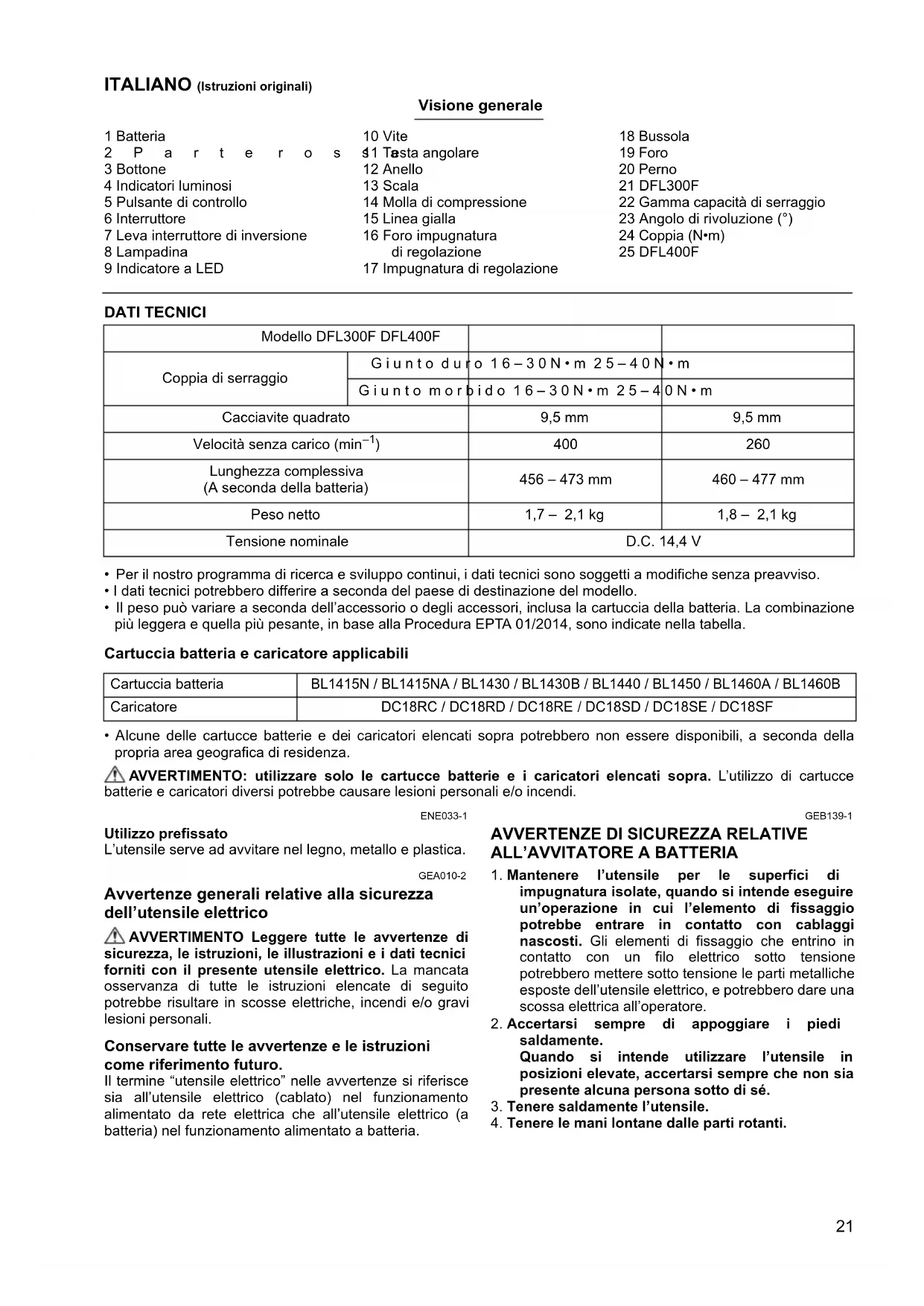 Nur für europäische Länder Die EG-Konformitätserklärung ist als Anhang A in dieser Bedienungsanleitung enthalten.21 ITALIANO (Istruzioni originali) Visione generale 1 Batteria 2Parte rossa 3 Bottone 4 Indicatori luminosi 5 Pulsante di controllo 6 Interruttore 7 Leva interruttore di inversione 8 Lampadina 9 Indicatore a LED 10 Vite 11 Testa angolare 12 Anello 13 Scala 14 Molla di compressione 15 Linea gialla 16 Foro impugnatura di regolazione 17 Impugnatura di regolazione 18 Bussola 19 Foro 20 Perno 21 DFL300F 22 Gamma capacità di serraggio 23 Angolo di rivoluzione (°) 24 Coppia (N•m) 25 DFL400F DATI TECNICI