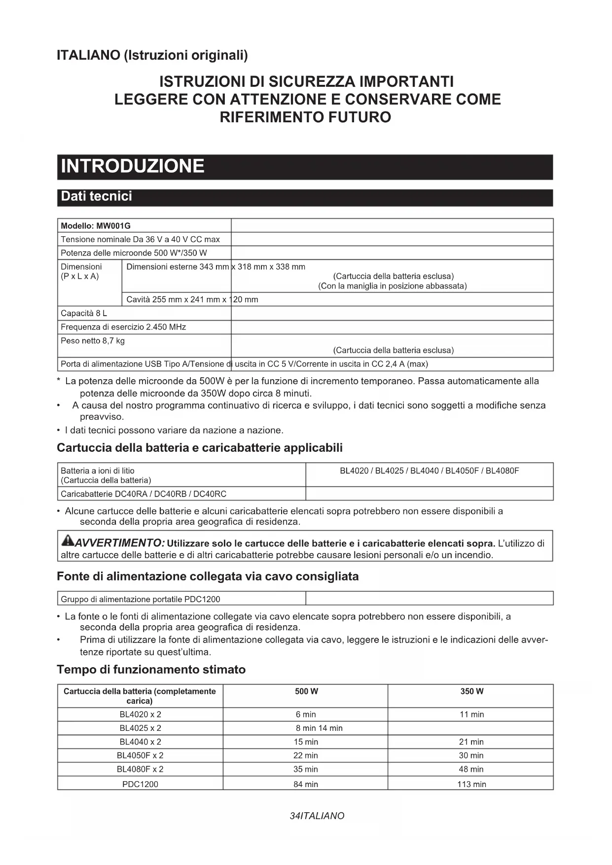 - Prima di utilizzare la fonte di alimentazione collegata via cavo, leggere le istruzioni e le indicazioni delle avver- tenze riportate su quest’ultima. Tempo di funzionamento stimato Cartuccia della batteria (completamente carica)500 W 350 WBL4020 x 2 6 min 11 minBL4025 x 2 8 min 14 minBL4040 x 2 15 min 21 minBL4050F x 2 22 min 30 minBL4080F x 2 35 min 48 minPDC1200 84 min 113 min35 ITALIANO NOTA: I valori sono approssimativi e possono variare a seconda dello stato di carica e delle condizioni d’uso. NOTA: Il tempo di funzionamento stimato con una sola batteria è pari a circa la metà del tempo quando si utiliz- zano due batterie. Utilizzo previsto Questo elettrodomestico è destinato al riscaldamento di alimenti. Misure di sicurezza importanti AVVERTENZA: Questo elettrodomestico va sottopo- sto a interventi di assistenza solo da parte di perso- nale di assistenza qualicato. Per ispezioni, ripara- zioni o regolazioni, contattare il centro di assistenza autorizzato più vicino. AVVERTENZA: Non tentare di far funzionare questo elettrodomestico con lo sportello aperto, poiché il funzionamento con lo sportello aperto può risul- tare in un’esposizione dannosa all’energia delle microonde. AVVERTENZA: In caso di danneggiamento dello sportello (piegato), delle cerniere (rotte o allentate), delle guarnizioni dello sportello o della supercie di tenuta, è necessario non utilizzare il forno a microonde no a quando sia stato riparato da una persona esperta. AVVERTENZA: È pericoloso per chiunque non sia una persona esperta eseguire qualsiasi intervento di assistenza o riparazione che implichi la rimo- zione di qualsiasi copertura che fornisca protezione dall’esposizione all’energia delle microonde. AVVERTENZA: Utilizzare questo elettrodomestico esclusivamente per l’uso a cui è destinato, come descritto nel manuale. AVVERTENZA: Non utilizzare prodotti chimici o vapori corrosivi in questo elettrodomestico. AVVERTENZA: Questo tipo di elettrodomestico è progettato specicamente per riscaldare, cucinare o far seccare alimenti. Non è progettato per l’utilizzo industriale o di laboratorio. AVVERTENZA: Non riscaldare liquidi o altri alimenti all’interno di contenitori sigillati, poiché potrebbero esplodere.