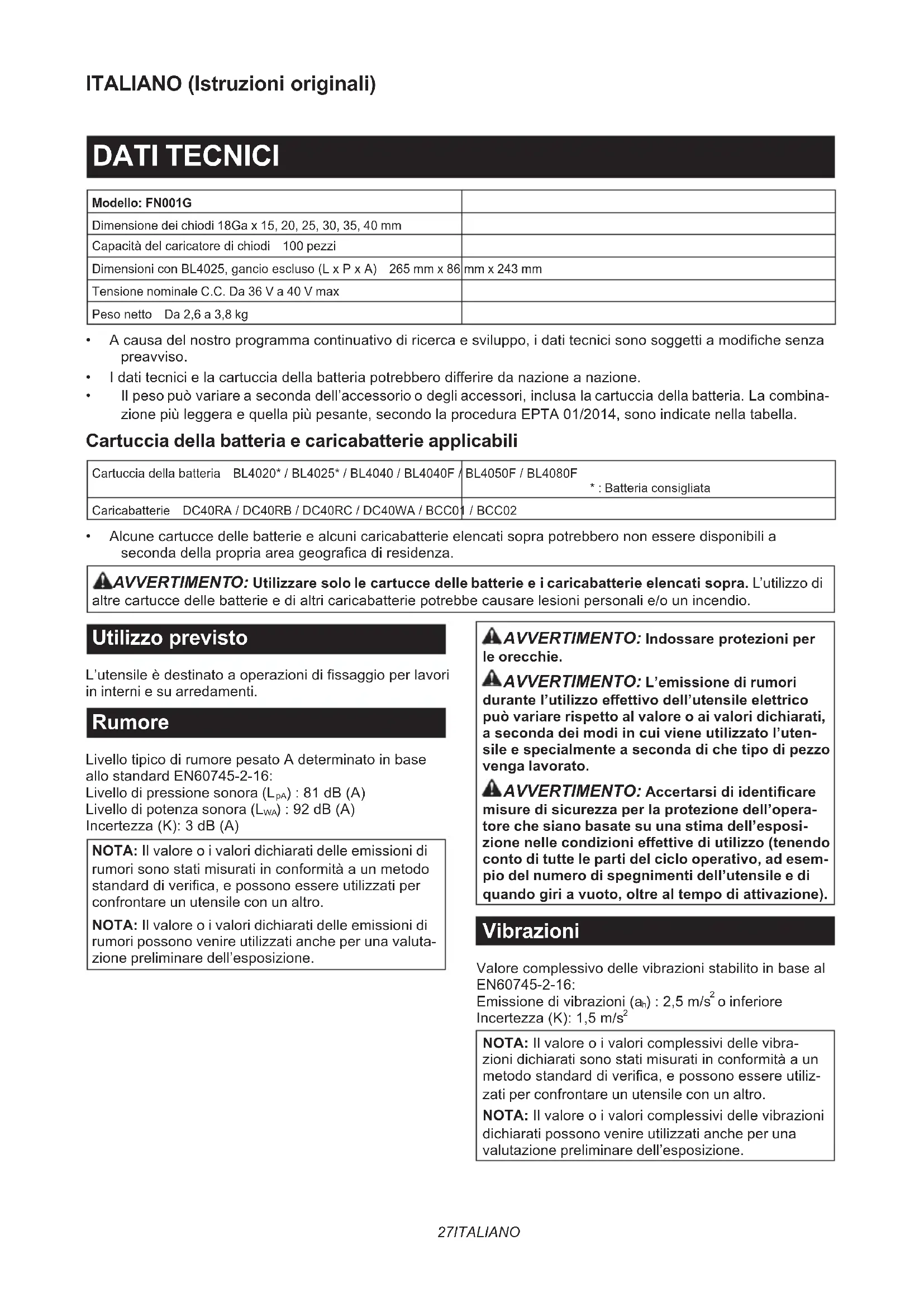 NOTA:Ilvaloreoivaloricomplessividellevibra- zionidichiaratisonostatimisuratiinconformitàaun metodostandarddiverica,epossonoessereutiliz- zati per confrontare un utensile con un altro. NOTA:Ilvaloreoivaloricomplessividellevibrazioni dichiarati possono venire utilizzati anche per una valutazione preliminare dell’esposizione.28 ITALIANO AVVERTIMENTO: L’emissione delle vibra- zioni durante l’utilizzo eettivo dell’utensile elettrico può variare rispetto al valore o ai valori dichiarati, a seconda dei modi in cui viene utiliz- zato l’utensile, specialmente a seconda di che tipo di pezzo venga lavorato. AVVERTIMENTO: Accertarsi di identicare misure di sicurezza per la protezione dell’opera- tore che siano basate su una stima dell’esposi- zione nelle condizioni eettive di utilizzo (tenendo conto di tutte le parti del ciclo operativo, ad esem- pio del numero di spegnimenti dell’utensile e di quando giri a vuoto, oltre al tempo di attivazione). Dichiarazioni di conformità Solo per i paesi europei LeDichiarazionidiconformitàsonoinclusenell’Allegato Aalpresentemanualed’uso. AVVERTENZE DI SICUREZZA Avvertenze generali relative alla sicurezza dell’utensile elettrico AVVERTIMENTO Leggere tutte le avvertenze di sicurezza, le istruzioni, le illustrazioni e i dati tecnici forniti insieme a questo utensile elettrico. La man- cataosservanzaditutteleistruzioniseguentipotrebbe risultareinscosseelettriche,incendie/ogravilesioni personali. Conservare tutte le avvertenze e le istruzioni come riferimento futuro. Iltermine“utensileelettrico”nelleavvertenzesiriferisce siaall’utensileelettrico(cablato)nelfunzionamento alimentato da rete elettrica che all’utensile elettrico (a batteria)nelfunzionamentoalimentatoabatteria. Avvertenze di sicurezza relative alla chiodatrice a batteria
