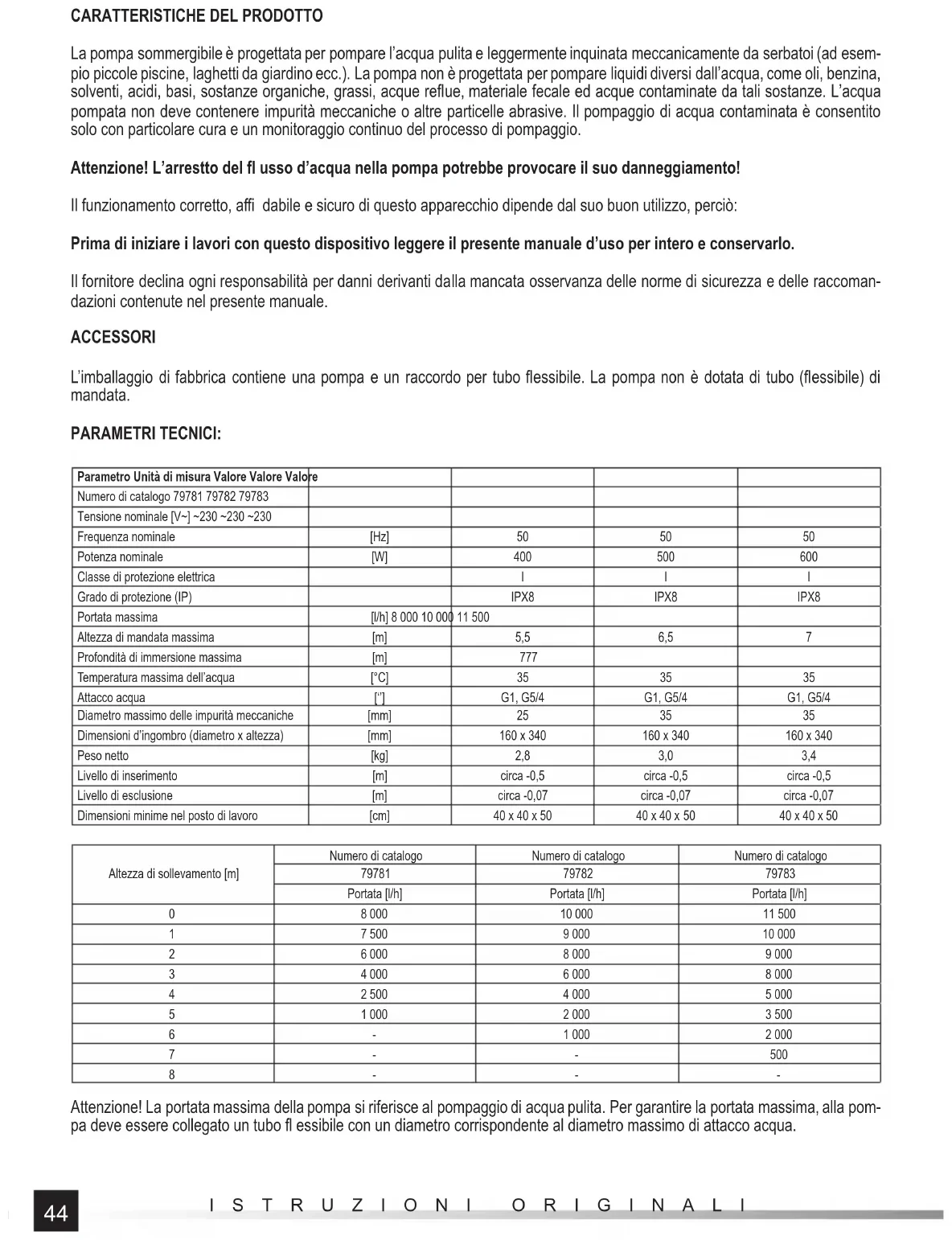 La pompa sommergibile è progettata per pompare l’acqua pulita e leggermente inquinata meccanicamente da serbatoi (ad esem- pio piccole piscine, laghetti da giardino ecc.). La pompa non è progettata per pompare liquidi diversi dall’acqua, come oli, benzina, solventi, acidi, basi, sostanze organiche, grassi, acque refl ue, materiale fecale ed acque contaminate da tali sostanze. L’acqua pompata non deve contenere impurità meccaniche o altre particelle abrasive. Il pompaggio di acqua contaminata è consentito solo con particolare cura e un monitoraggio continuo del processo di pompaggio. Attenzione! L’arrestto del fl usso d’acqua nella pompa potrebbe provocare il suo danneggiamento! Il funzionamento corretto, affi dabile e sicuro di questo apparecchio dipende dal suo buon utilizzo, perciò: Prima di iniziare i lavori con questo dispositivo leggere il presente manuale d’uso per intero e conservarlo. Il fornitore declina ogni responsabilità per danni derivanti dalla mancata osservanza delle norme di sicurezza e delle raccoman- dazioni contenute nel presente manuale. ACCESSORI L’imballaggio di fabbrica contiene una pompa e un raccordo per tubo fl essibile. La pompa non è dotata di tubo (fl essibile) di mandata. PARAMETRI TECNICI: Parametro Unità di misura Valore Valore Valore Numero di catalogo 79781 79782 79783 Tensione nominale [V~] ~230 ~230 ~230 Frequenza nominale [Hz] 50 50 50 Potenza nominale [W] 400 500 600 Classe di protezione elettrica I I I Grado di protezione (IP) IPX8 IPX8 IPX8 Portata massima [l/h] 8 000 10 000 11 500 Altezza di mandata massima [m] 5,5 6,5 7 Profondità di immersione massima [m] 777 Temperatura massima dell’acqua [°C] 35 35 35 Attacco acqua [‘’] G1, G5/4 G1, G5/4 G1, G5/4 Diametro massimo delle impurità meccaniche [mm] 25 35 35 Dimensioni d’ingombro (diametro x altezza) [mm] 160 x 340 160 x 340 160 x 340 Peso netto [kg] 2,8 3,0 3,4 Livello di inserimento [m] circa -0,5 circa -0,5 circa -0,5 Livello di esclusione [m] circa -0,07 circa -0,07 circa -0,07 Dimensioni minime nel posto di lavoro [cm] 40 x 40 x 50 40 x 40 x 50 40 x 40 x 50 Altezza di sollevamento [m] Numero di catalogo Numero di catalogo Numero di catalogo